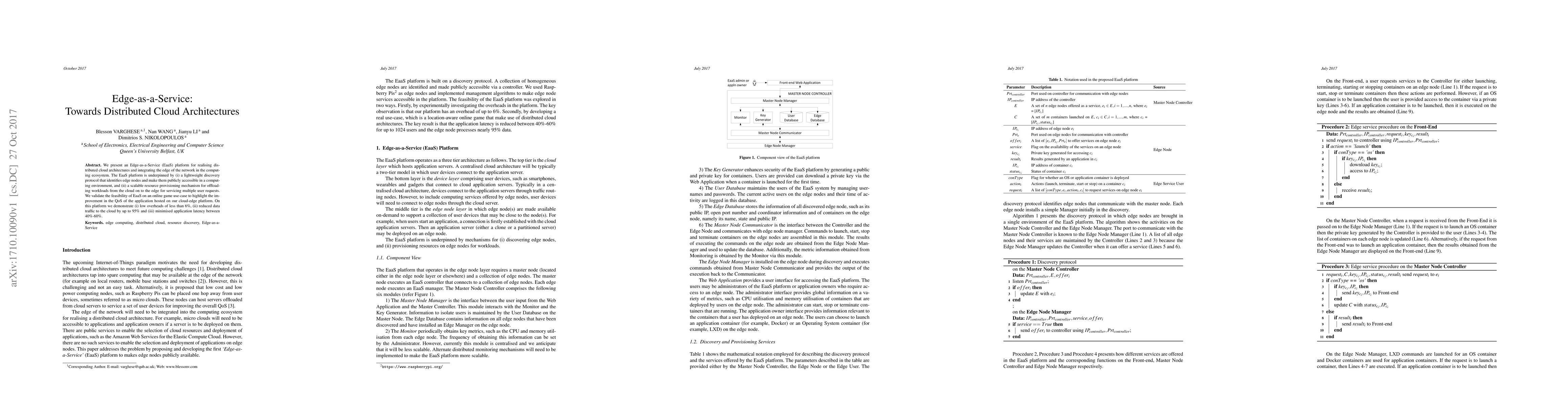 This paper introduces an Edge-as-a-Service (EaaS) platform for distributed cloud architectures, featuring a lightweight discovery protocol and a scalable resource provisioning mechanism. It demonstrates significant improvements in QoS, reduced data traffic, and minimized latency for an online game application.
