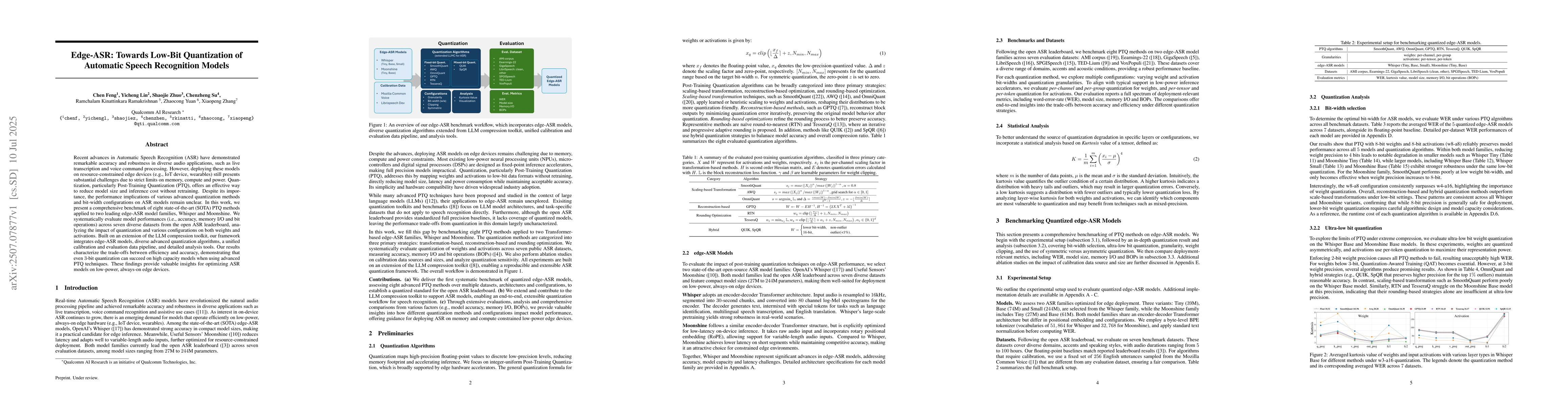 Recent advances in Automatic Speech Recognition (ASR) have demonstrated remarkable accuracy and robustness in diverse audio applications, such as live transcription and voice command processing. However, deploying these models on resource constrained edge devices (e.g., IoT device, wearables) still presents substantial challenges due to strict limits on memory, compute and power. Quantization, particularly Post-Training Quantization (PTQ), offers an effective way to reduce model size and inference cost without retraining. Despite its importance, the performance implications of various advanced quantization methods and bit-width configurations on ASR models remain unclear. In this work, we present a comprehensive benchmark of eight state-of-the-art (SOTA) PTQ methods applied to two leading edge-ASR model families, Whisper and Moonshine. We systematically evaluate model performances (i.e., accuracy, memory I/O and bit operations) across seven diverse datasets from the open ASR leaderboard, analyzing the impact of quantization and various configurations on both weights and activations. Built on an extension of the LLM compression toolkit, our framework integrates edge-ASR models, diverse advanced quantization algorithms, a unified calibration and evaluation data pipeline, and detailed analysis tools. Our results characterize the trade-offs between efficiency and accuracy, demonstrating that even 3-bit quantization can succeed on high capacity models when using advanced PTQ techniques. These findings provide valuable insights for optimizing ASR models on low-power, always-on edge devices.
