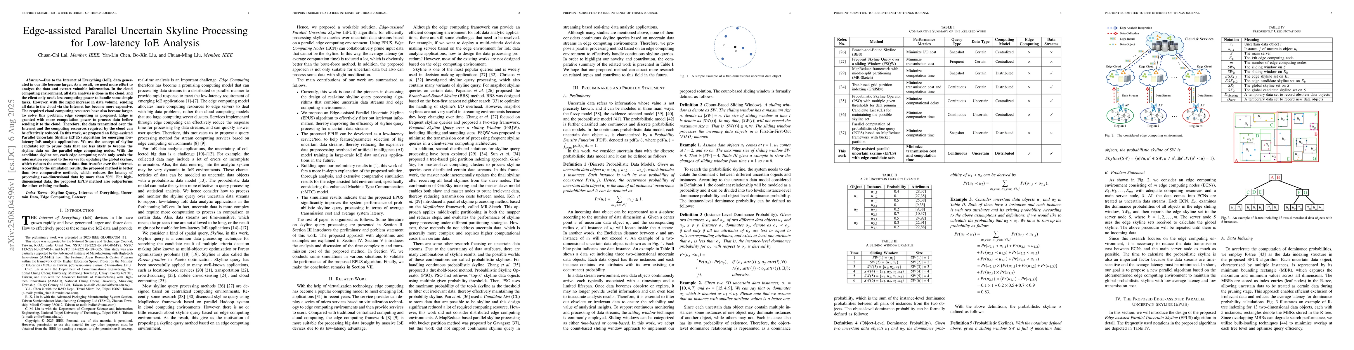 The research introduces Edge-assisted Parallel Uncertain Skyline (EPUS), an algorithm designed for low-latency Internet of Everything (IoE) data analysis. EPUS reduces data transfer to the cloud by using edge computing nodes to identify and send only relevant skyline candidate data, resulting in over 50% latency reduction for two-dimensional data and outperforming other methods for high-dimensional data.