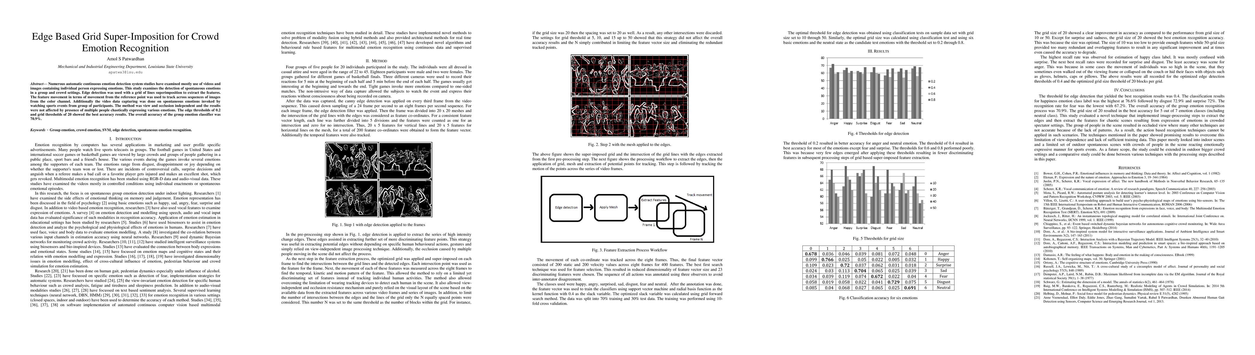 This study proposes an edge-based grid super-imposition method for recognizing spontaneous emotions in crowd settings, achieving 70.9% accuracy. The technique uses edge detection and grid overlay to extract features, which remain effective despite view, occlusion, and multiple people.