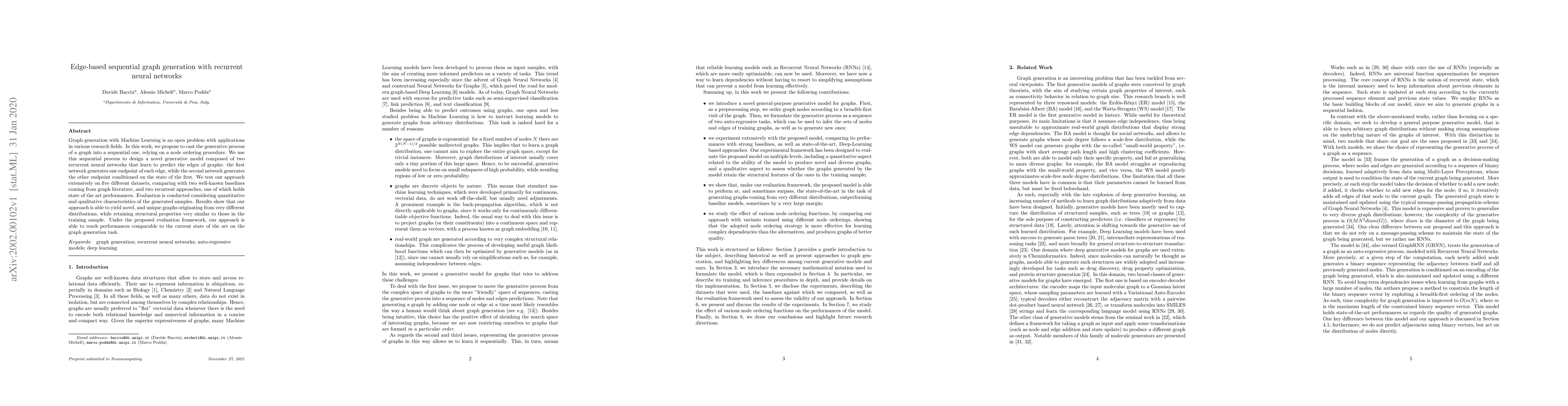 Graph generation with Machine Learning is an open problem with applications in various research fields. In this work, we propose to cast the generative process of a graph into a sequential one, relying on a node ordering procedure. We use this sequential process to design a novel generative model composed of two recurrent neural networks that learn to predict the edges of graphs: the first network generates one endpoint of each edge, while the second network generates the other endpoint conditioned on the state of the first. We test our approach extensively on five different datasets, comparing with two well-known baselines coming from graph literature, and two recurrent approaches, one of which holds state of the art performances. Evaluation is conducted considering quantitative and qualitative characteristics of the generated samples. Results show that our approach is able to yield novel, and unique graphs originating from very different distributions, while retaining structural properties very similar to those in the training sample. Under the proposed evaluation framework, our approach is able to reach performances comparable to the current state of the art on the graph generation task.