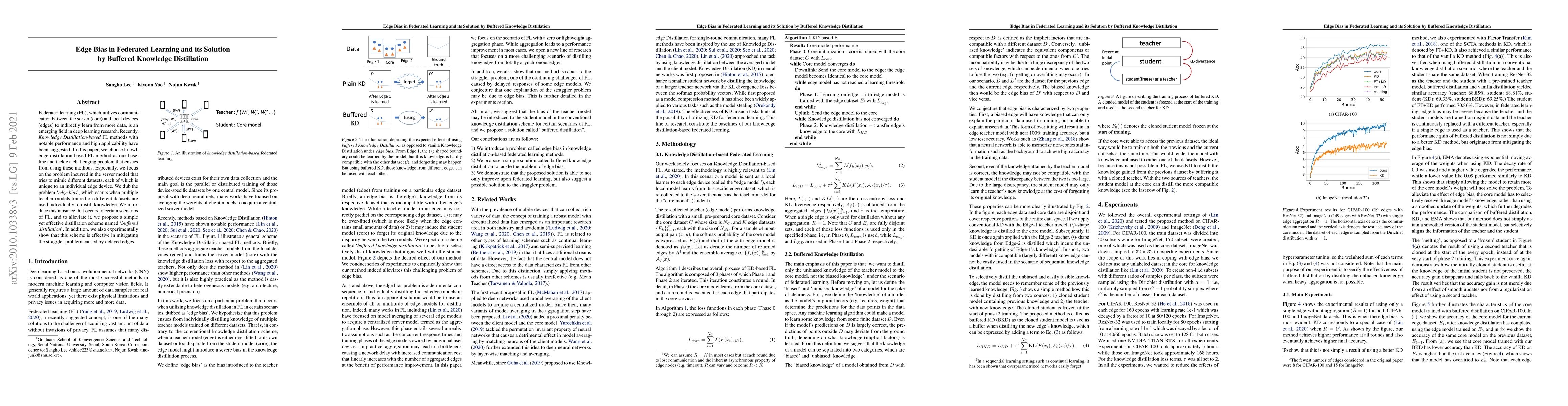 This paper addresses the 'edge bias' issue in federated learning, where server models struggle to mimic diverse datasets from individual edge devices. To mitigate this, the authors propose a 'buffered knowledge distillation' scheme that effectively reduces edge bias and also alleviates the straggler problem caused by delayed edge updates.