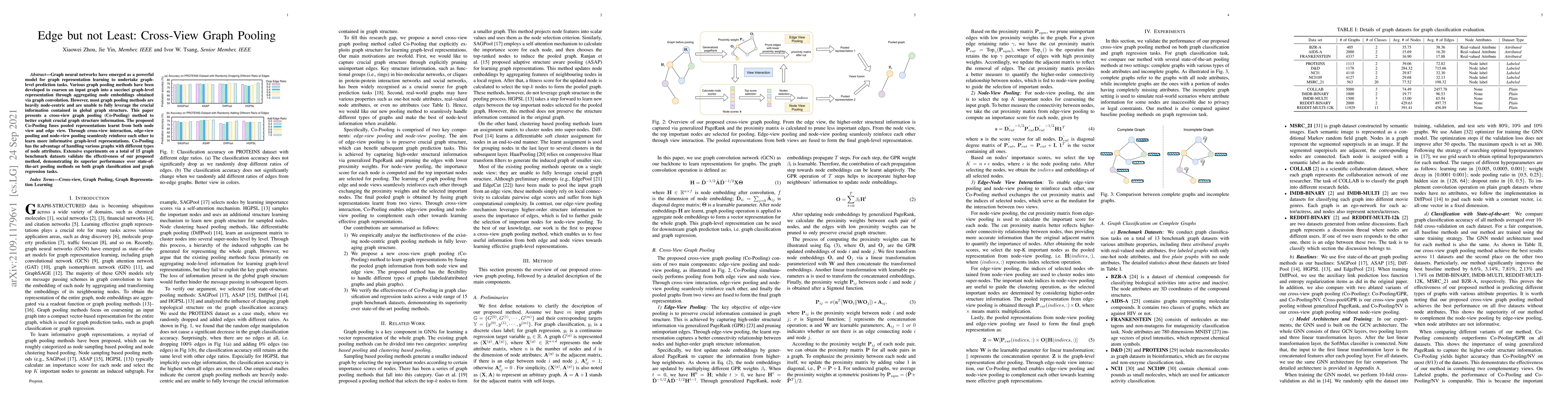 This paper introduces a cross-view graph pooling method (Co-Pooling) that integrates node and edge-view representations to better exploit global graph structure information for graph representation learning. Experimental results show that Co-Pooling outperforms state-of-the-art methods on various graph classification and regression tasks.