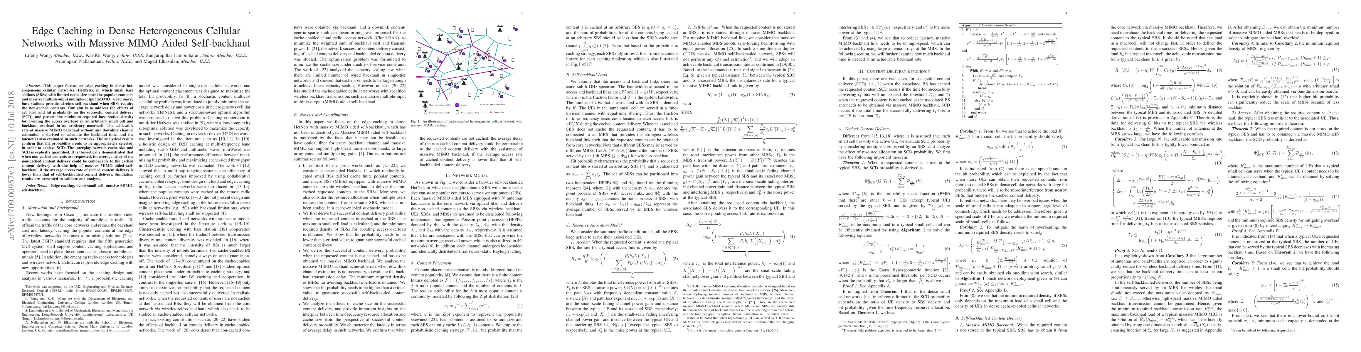 This paper investigates edge caching in dense heterogeneous cellular networks with massive MIMO for self-backhaul, aiming to optimize content delivery by balancing cache hit probability and cell load. Analytical results show that massive MIMO can significantly reduce delays for non-cached content delivery, validating the effectiveness of the proposed caching strategy.