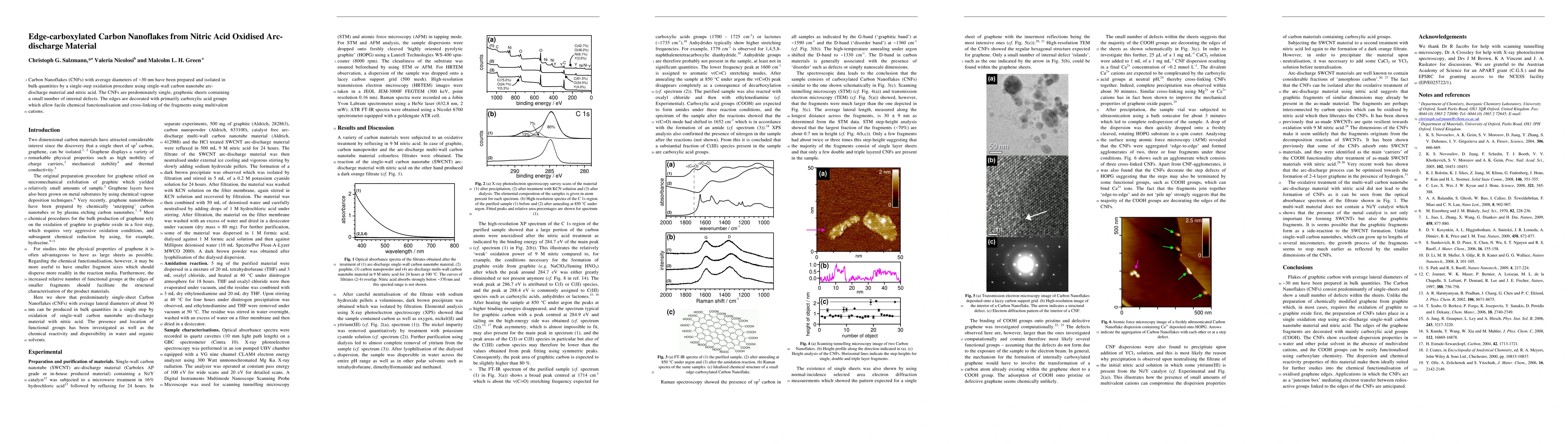 Carbon Nanoflakes (CNFs) with average diameters of about 30 nm have been prepared and isolated in bulk quantities by a single-step oxidation procedure using single-wall carbon nanotube arc-discharge material and nitric acid. The CNFs are predominately single, graphenic sheets containing a small number of internal defects. The edges are decorated with primarily carboxylic acid groups which allow facile chemical functionalisation and cross-linking of the fragments using multivalent cations.