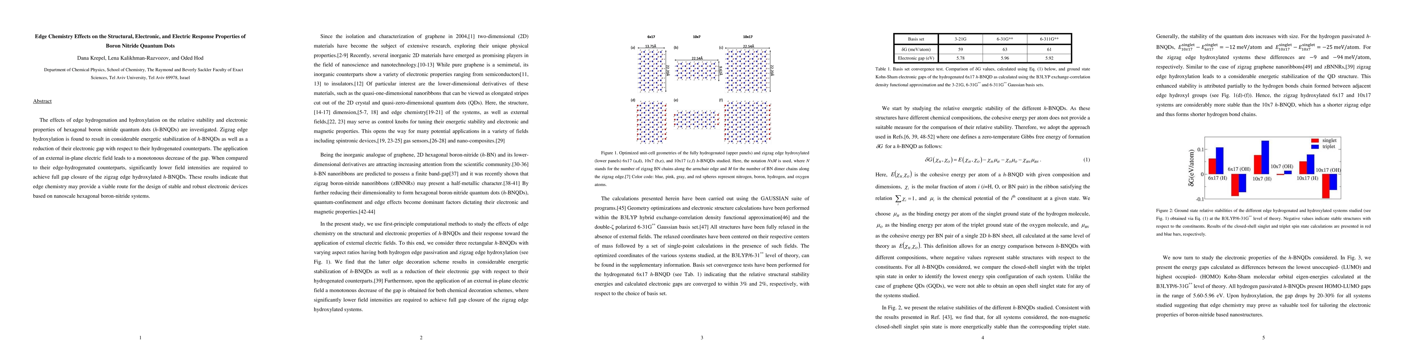 This study investigates how edge hydrogenation and hydroxylation affect the stability and electronic properties of hexagonal boron nitride quantum dots (h-BNQDs). Zigzag edge hydroxylation stabilizes h-BNQDs and reduces their electronic gap compared to hydrogenated edges, with lower electric field intensities needed for gap closure, suggesting potential for designing stable nanoscale electronic devices.