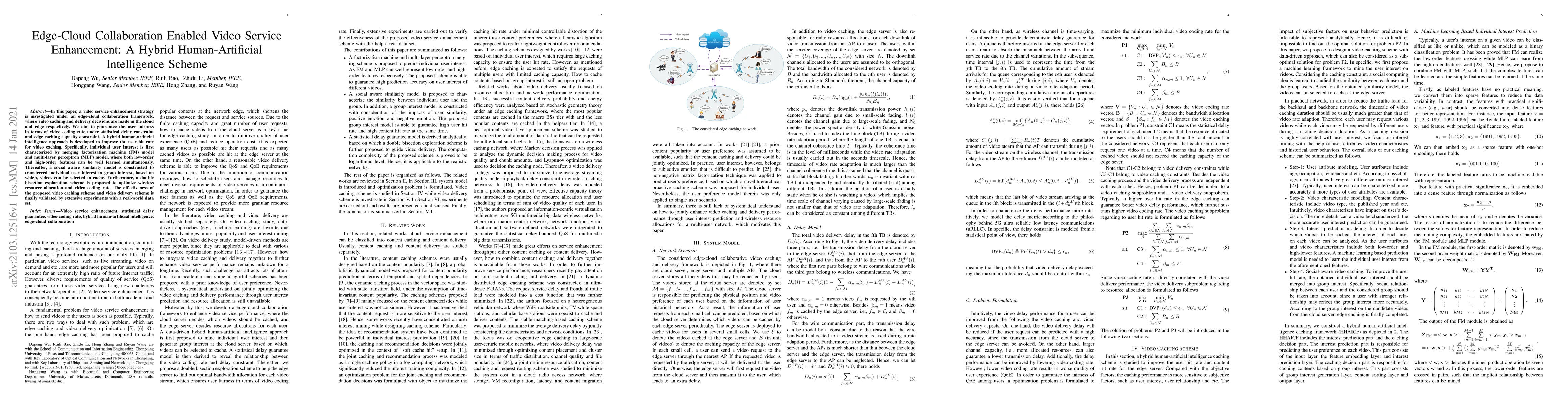 In this paper, a video service enhancement strategy is investigated under an edge-cloud collaboration framework, where video caching and delivery decisions are made in the cloud and edge respectively. We aim to guarantee the user fairness in terms of video coding rate under statistical delay constraint and edge caching capacity constraint. A hybrid human-artificial intelligence approach is developed to improve the user hit rate for video caching. Specifically, individual user interest is first characterized by merging factorization machine (FM) model and multi-layer perceptron (MLP) model, where both low-order and high-order features can be well learned simultaneously. Thereafter, a social aware similarity model is constructed to transferred individual user interest to group interest, based on which, videos can be selected to cache. Furthermore, a double bisection exploration scheme is proposed to optimize wireless resource allocation and video coding rate. The effectiveness of the proposed video caching scheme and video delivery scheme is finally validated by extensive experiments with a real-world data set.