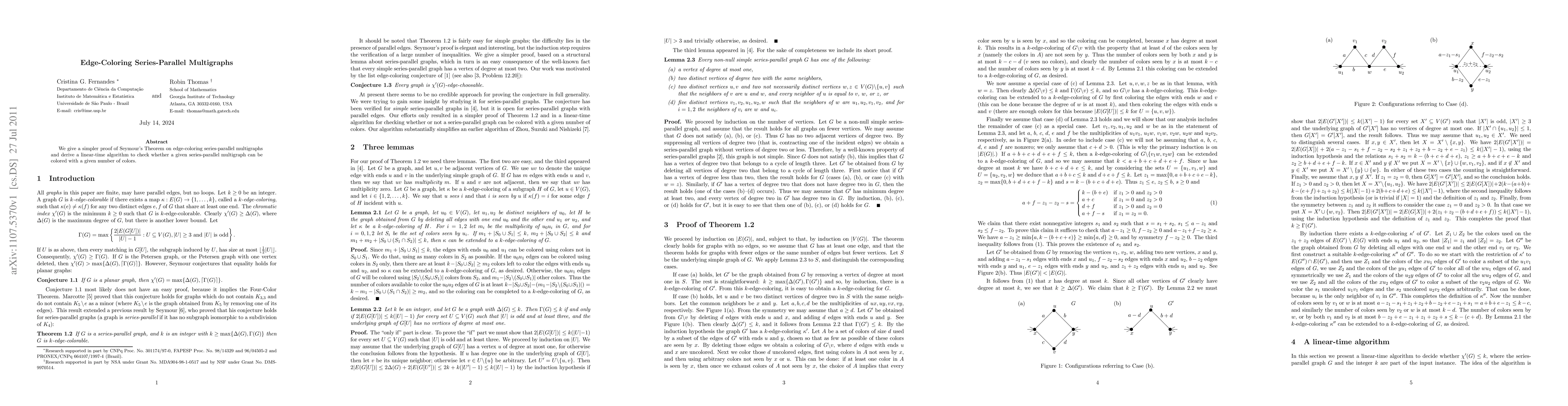 This paper presents a simpler proof for Seymour's Theorem on edge-coloring series-parallel multigraphs and introduces a linear-time algorithm to determine if a given series-parallel multigraph can be colored with a specified number of colors.
