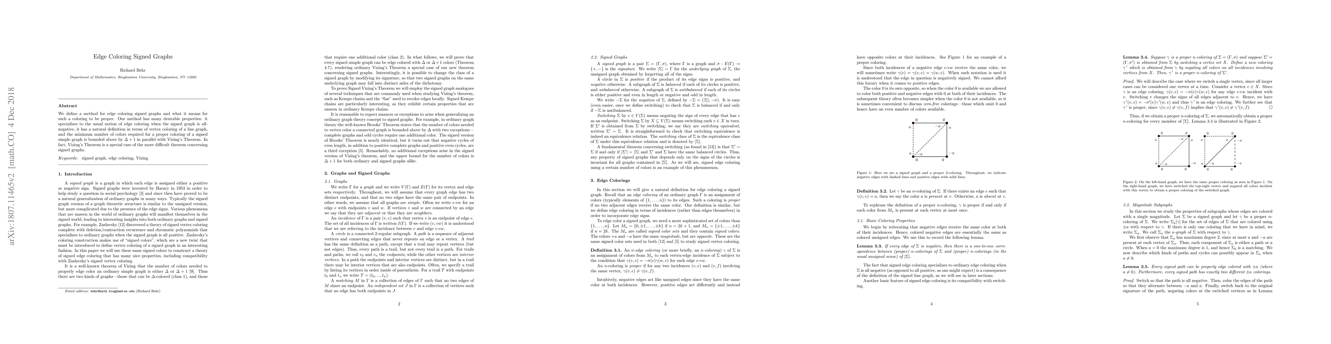 The paper defines a method for edge coloring signed graphs, introducing the concept of proper edge coloring for signed graphs, and establishes a relationship with Vizing's Theorem for ordinary graphs.