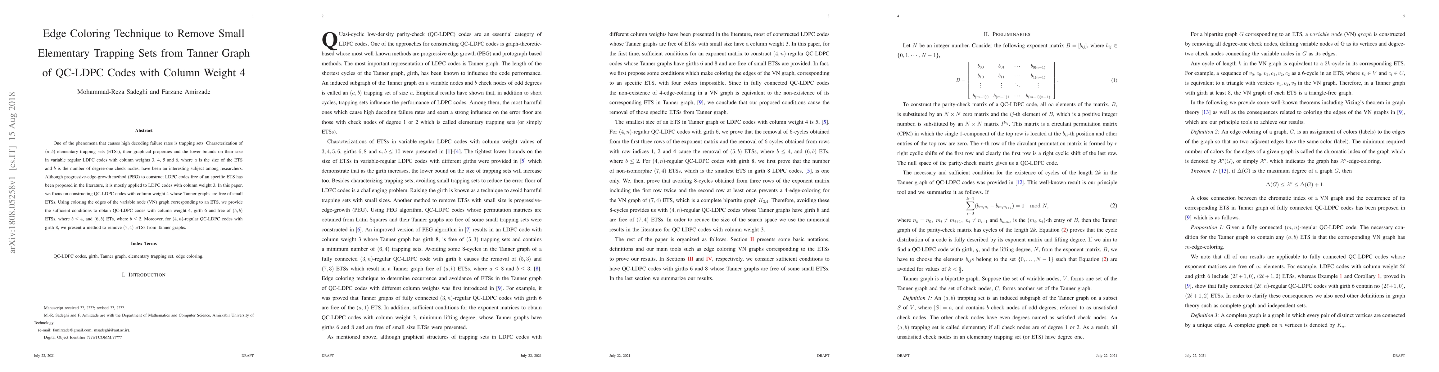 This paper proposes an edge coloring technique to construct quasi-cyclic low-density parity-check (QC-LDPC) codes with column weight 4, ensuring their Tanner graphs are free of small elementary trapping sets. It focuses on removing $(5,b)$ and $(6,b)$ ETSs for specific values of $b$, and $(7,4)$ ETSs for $(4,n)$-regular QC-LDPC codes with girth 8.