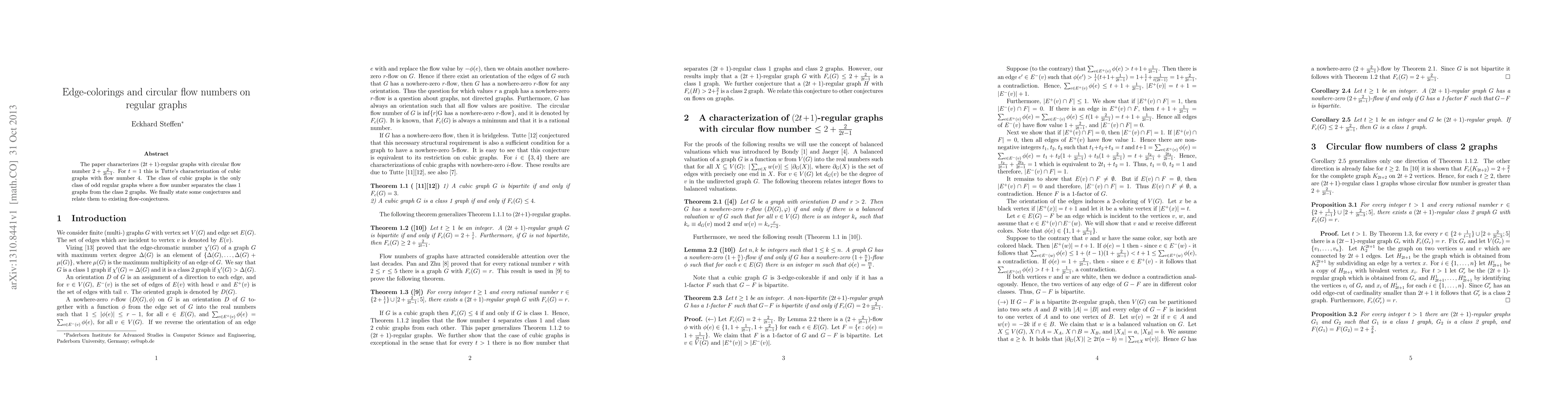 The paper characterizes $(2t+1)$-regular graphs with a specific circular flow number, extending Tutte's characterization for cubic graphs. It highlights that cubic graphs uniquely separate into class 1 and class 2 based on flow number.