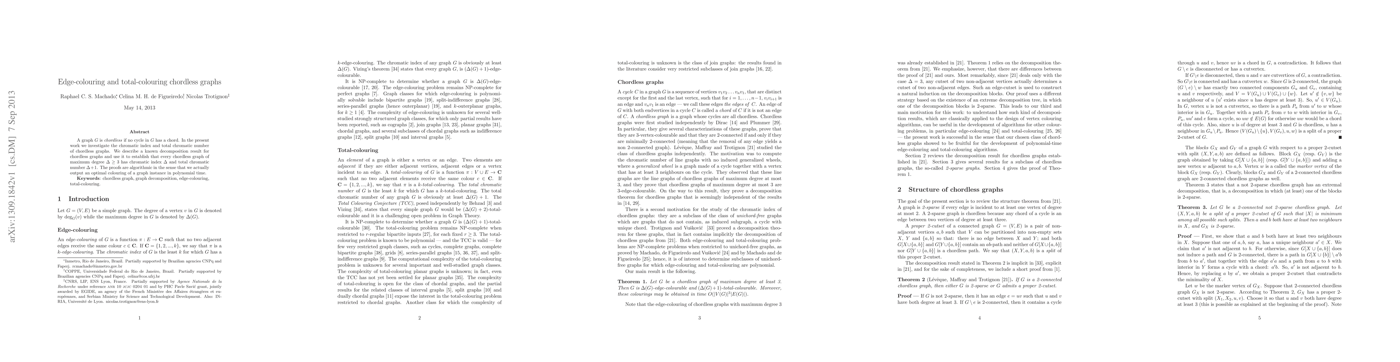 This paper explores the chromatic index and total chromatic number of chordless graphs, proving that graphs with maximum degree $\Delta \geq 3$ have a chromatic index of $\Delta$ and a total chromatic number of $\Delta + 1$. The study provides polynomial-time algorithms that yield optimal colourings.