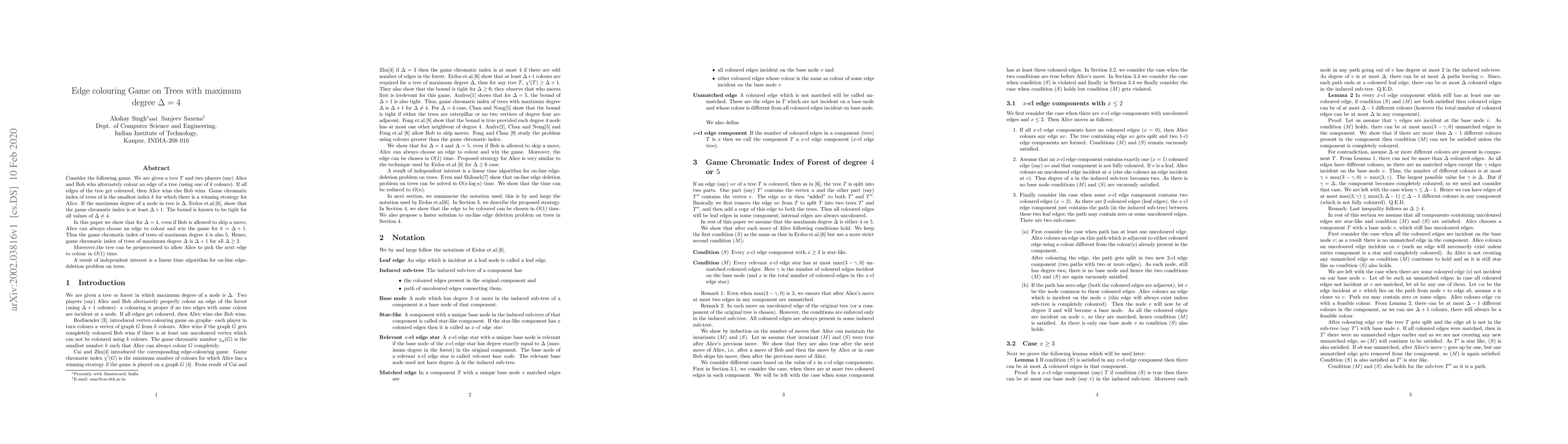 The paper presents a novel winning strategy for Alice in the edge coloring game on trees with Δ=4, extending the game chromatic index result to all Δ≥2, and provides a linear-time algorithm for the on-line edge-deletion problem on trees.