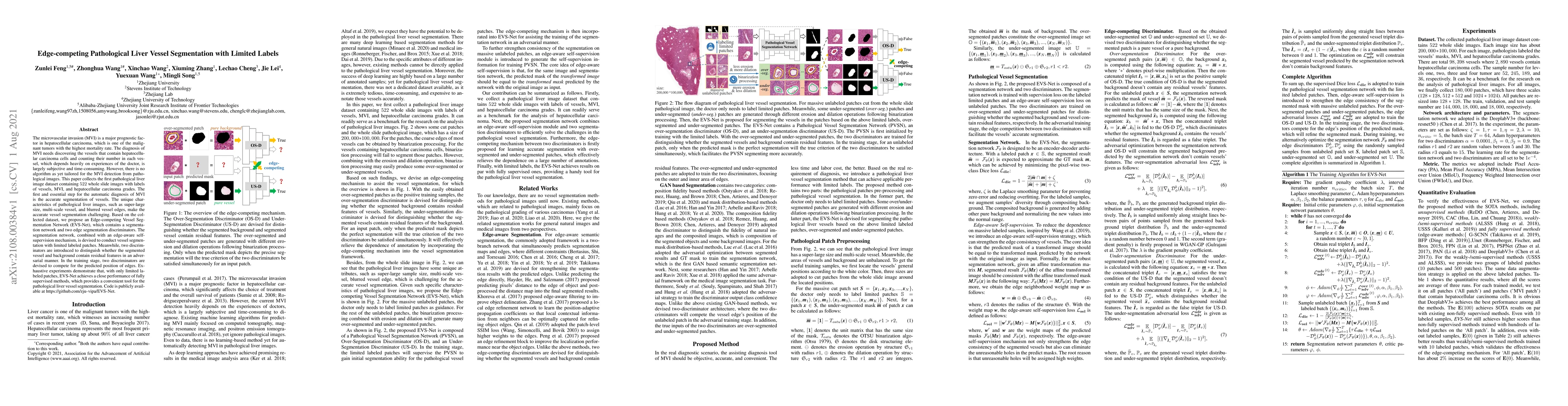 This paper introduces a novel Edge-competing Vessel Segmentation Network (EVS-Net) to accurately segment pathological liver vessels, addressing the challenge of microvascular invasion detection in hepatocellular carcinoma. The proposed method leverages limited labeled patches and an edge-based self-supervision mechanism to achieve performance comparable to fully supervised methods.