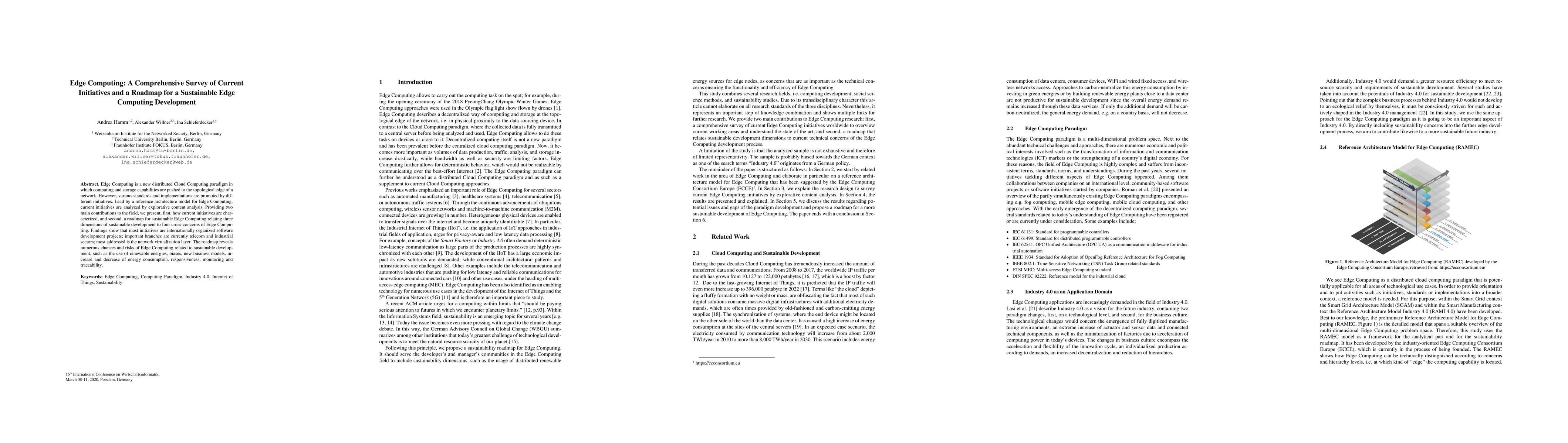 Edge Computing is a new distributed Cloud Computing paradigm in which computing and storage capabilities are pushed to the topological edge of a network. However, various standards and implementations are promoted by different initiatives. Lead by a reference architecture model for Edge Computing, current initiatives are analyzed by explorative content analysis. Providing two main contributions to the field, we present, first, how current initiatives are characterized, and second, a roadmap for sustainable Edge Computing relating three dimensions of sustainable development to four cross-concerns of Edge Computing. Findings show that most initiatives are internationally organized software development projects; important branches are currently telecom and industrial sectors; most addressed is the network virtualization layer. The roadmap reveals numerous chances and risks of Edge Computing related to sustainable development; such as the use of renewable energies, biases, new business models, increase and decrease of energy consumption, responsiveness, monitoring and traceability.