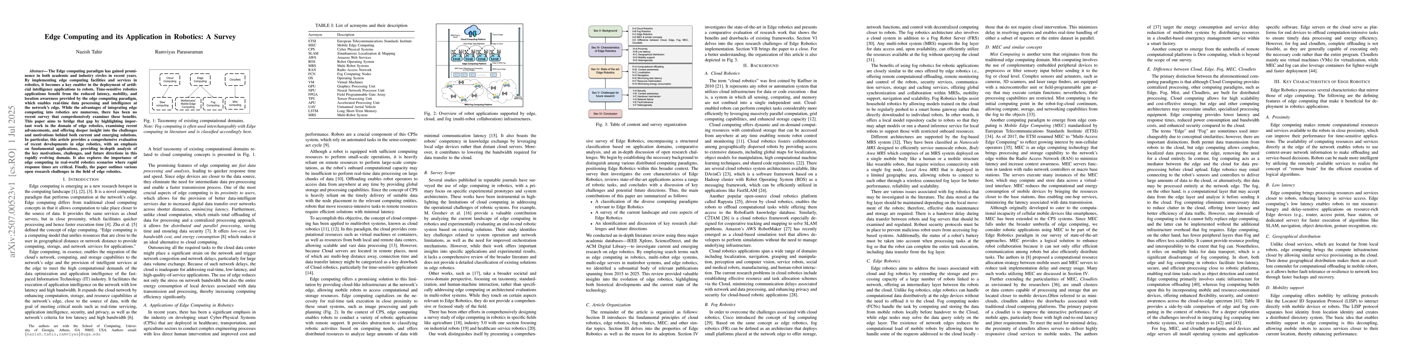 The Edge computing paradigm has gained prominence in both academic and industry circles in recent years. By implementing edge computing facilities and services in robotics, it becomes a key enabler in the deployment of artificial intelligence applications to robots. Time-sensitive robotics applications benefit from the reduced latency, mobility, and location awareness provided by the edge computing paradigm, which enables real-time data processing and intelligence at the network's edge. While the advantages of integrating edge computing into robotics are numerous, there has been no recent survey that comprehensively examines these benefits. This paper aims to bridge that gap by highlighting important work in the domain of edge robotics, examining recent advancements, and offering deeper insight into the challenges and motivations behind both current and emerging solutions. In particular, this article provides a comprehensive evaluation of recent developments in edge robotics, with an emphasis on fundamental applications, providing in-depth analysis of the key motivations, challenges, and future directions in this rapidly evolving domain. It also explores the importance of edge computing in real-world robotics scenarios where rapid response times are critical. Finally, the paper outlines various open research challenges in the field of edge robotics.