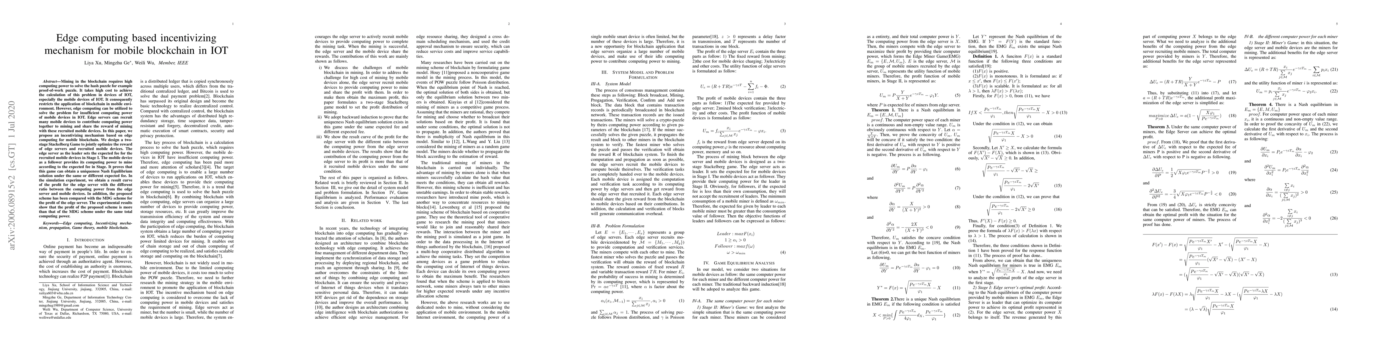 This paper proposes an edge computing-based incentivizing mechanism for mobile blockchain in IoT to address the high computing power requirement of blockchain mining. It utilizes edge servers to recruit mobile devices to collectively mine and share rewards, optimizing the reward distribution through a two-stage Stackelberg Game, which achieves a unique Nash Equilibrium. Simulation results show that the proposed scheme yields higher profit for edge servers compared to the MDG scheme.