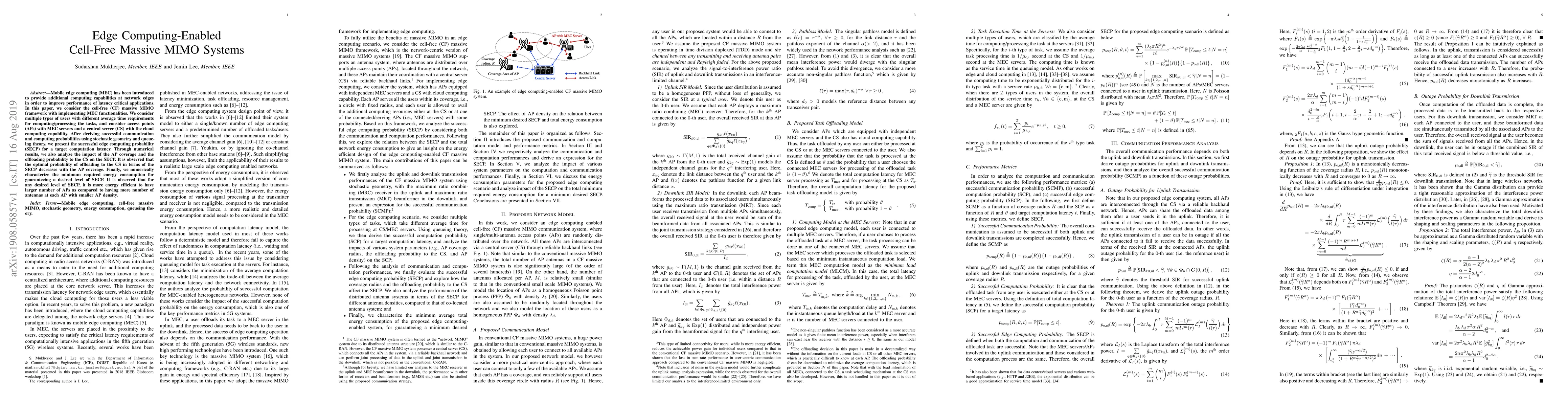 This paper explores the integration of mobile edge computing (MEC) within cell-free massive MIMO systems, analyzing the successful edge computing probability (SECP) under varying user and access point conditions. The study finds that optimal offloading to the central server decreases with greater AP coverage, and larger numbers of APs are more energy-efficient than increasing antenna density.