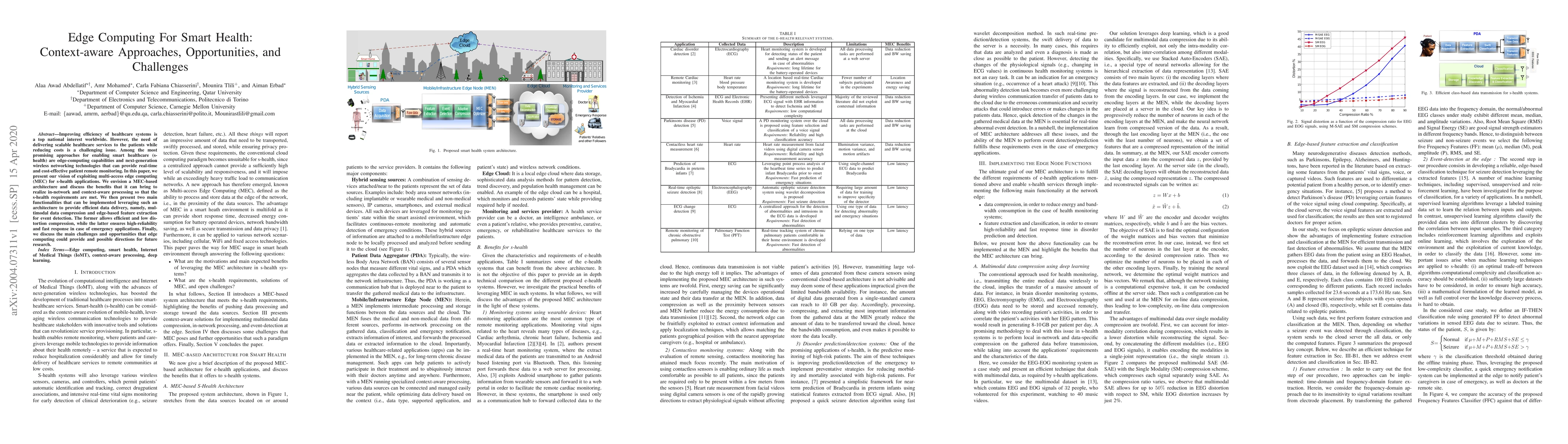 This paper explores the potential of multi-access edge computing (MEC) to enhance smart healthcare systems through context-aware processing, multimodal data compression, and edge-based feature extraction for emergency detection. It outlines the benefits and challenges of this approach, suggesting future research directions.