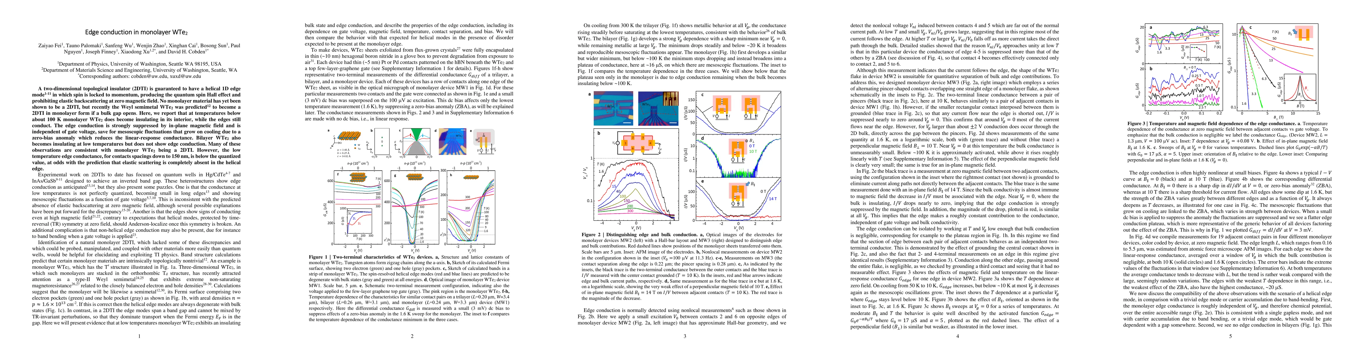 This study investigates monolayer WTe2, demonstrating that it becomes insulating in its interior below 100 K, while edge conduction persists. The edge conduction is suppressed by magnetic fields and shows a zero-bias anomaly, suggesting it may exhibit 2DTI characteristics, though the conductance does not reach quantized values.