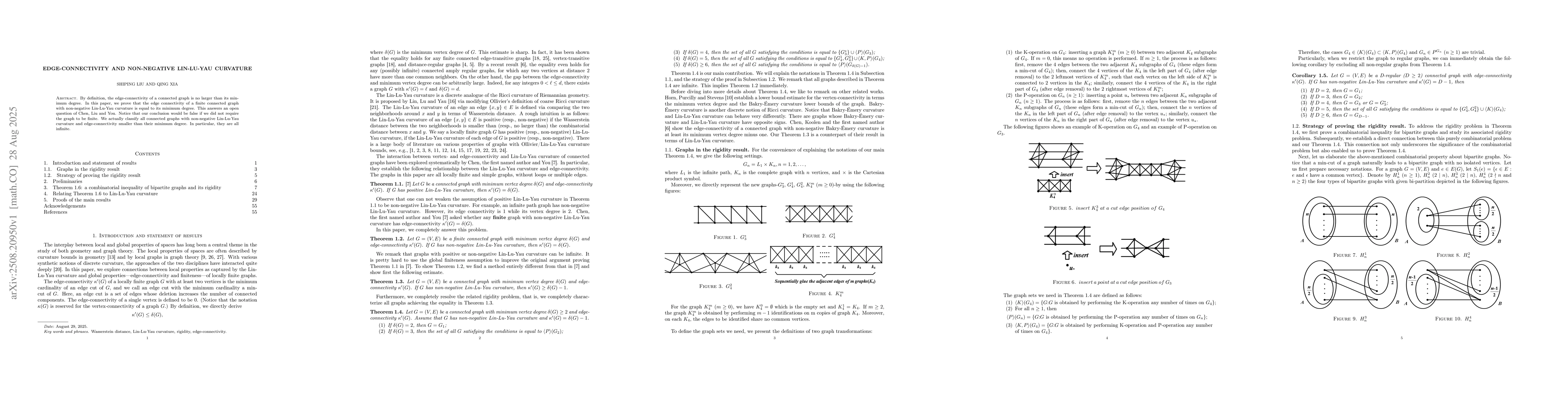 By definition, the edge-connectivity of a connected graph is no larger than its minimum degree. In this paper, we prove that the edge connectivity of a finite connected graph with non-negative Lin-Lu-Yau curvature is equal to its minimum degree. This answers an open question of Chen, Liu and You. Notice that our conclusion would be false if we did not require the graph to be finite. We actually classify all connected graphs with non-negative Lin-Lu-Yau curvature and edge-connectivity smaller than their minimum degree. In particular, they are all infinite.