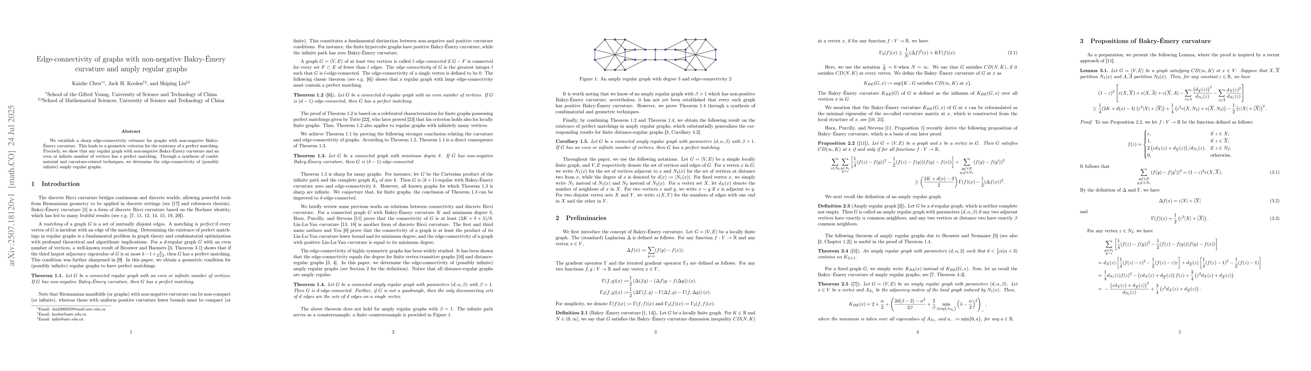We establish a sharp edge-connectivity estimate for graphs with non-negative Bakry-\'Emery curvature. This leads to a geometric criterion for the existence of a perfect matching. Precisely, we show that any regular graph with non-negative Bakry-\'Emery curvature and an even or infinite number of vertices has a perfect matching. Through a synthesis of combinatorial and curvature-related techniques, we determine the edge-connectivity of (possibly infinite) amply regular graphs.