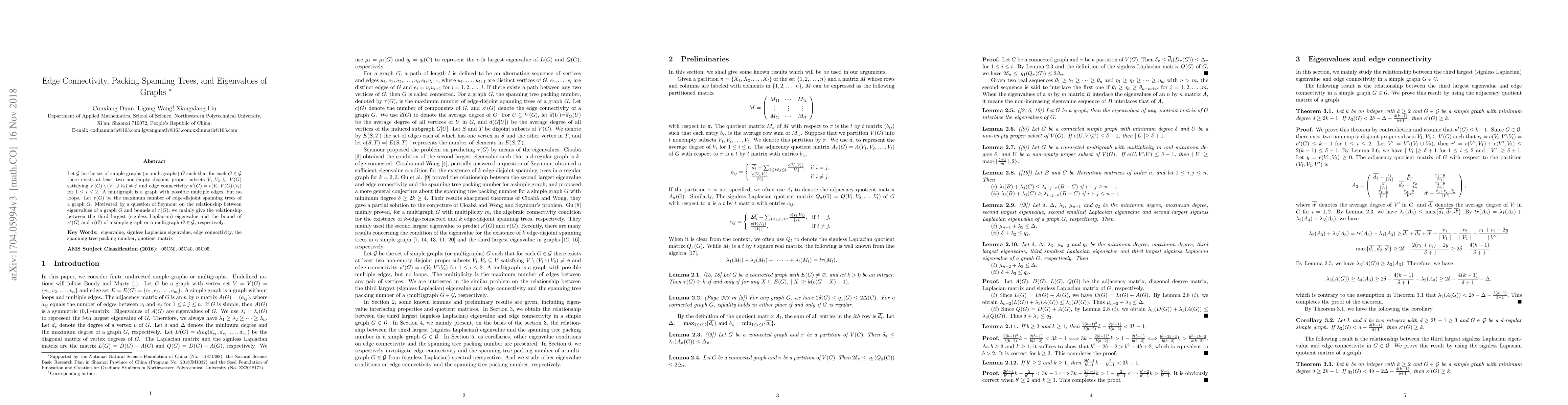 This paper explores the relationship between edge connectivity, packing spanning trees, and the third largest eigenvalue of the signless Laplacian in graphs where certain disjoint subsets exist. It investigates how these graph properties are interconnected, particularly focusing on multigraphs and simple graphs within a defined set.