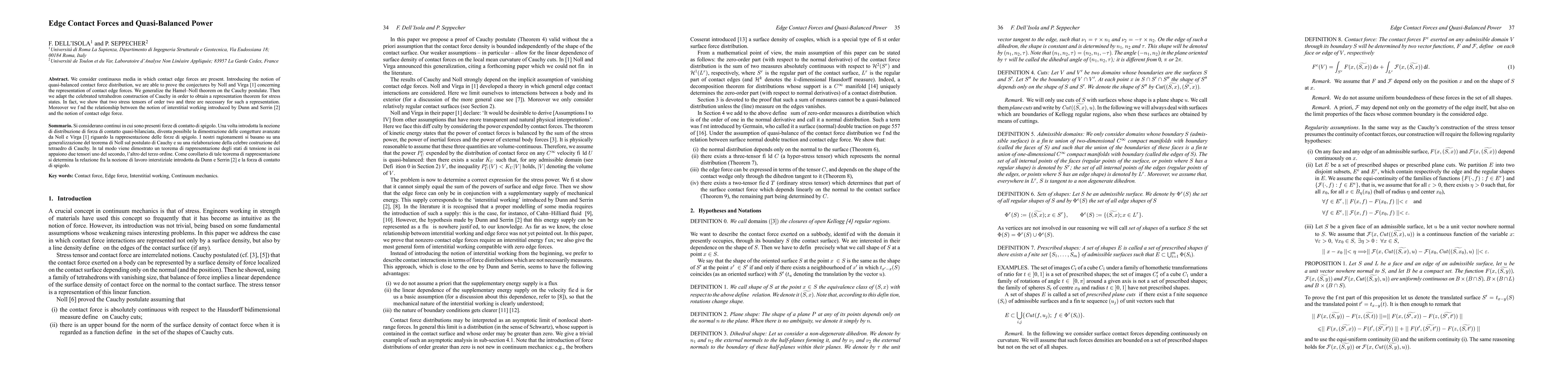 Researchers prove a conjecture about contact edge forces in continuous media, showing that two stress tensors of order two and three are necessary for representation, and connect it to concepts like interstitial working and the Cauchy postulate.