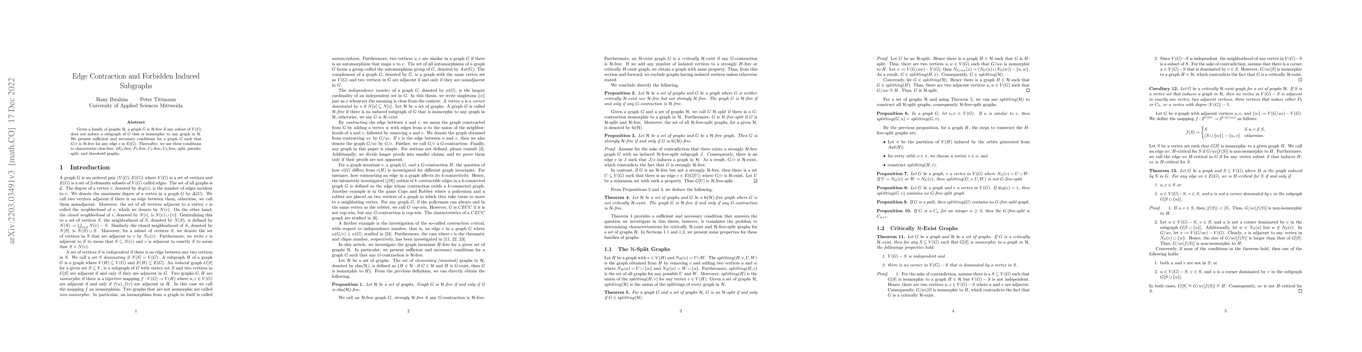 A graph $G$ is $H$-free if any subset of $V(G)$ does not induce a subgraph of $G$ that is isomorphic to $H$. Given a graph $H$, we present sufficient and necessary conditions for a graph $G$ such that $G/e$ is $H$-free for any edge $e$ in $E(G)$. Thereafter, we use these conditions to characterize forests, claw-free, $2K_{2}$-free, $C_{4}$-free, $C_{5}$-free, split, and pseudo-split graphs.