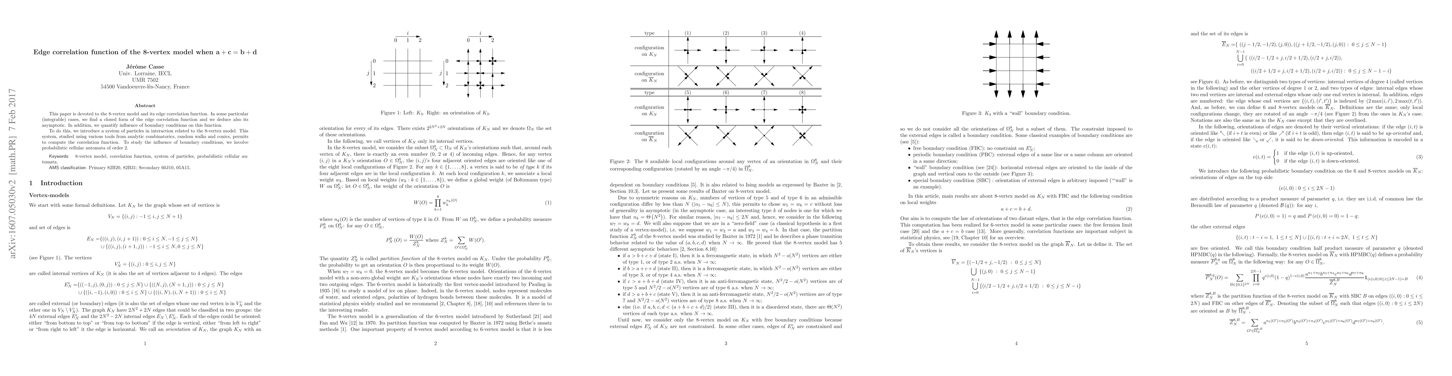 This paper is devoted to the 8-vertex model and its edge correlation function. In some particular (integrable) cases, we find a closed form of the edge correlation function and we deduce also its asymptotic. In addition, we quantify influence of boundary conditions on this function. To do this, we introduce a system of particles in interaction related to the 8-vertex model. This system, studied using various tools from analytic combinatorics, random walks and conics, permits to compute the correlation function. To study the influence of boundary conditions, we involve probabilistic cellular automata of order 2.