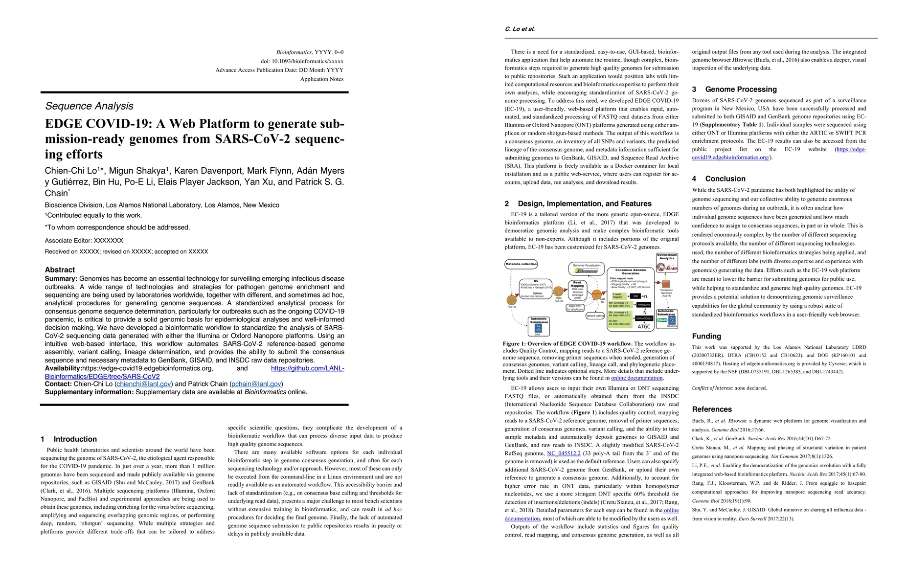 Genomics has become an essential technology for surveilling emerging infectious disease outbreaks. A wide range of technologies and strategies for pathogen genome enrichment and sequencing are being used by laboratories worldwide, together with different, and sometimes ad hoc, analytical procedures for generating genome sequences. As a result, public repositories now contain non-standard entries of varying quality. A standardized analytical process for consensus genome sequence determination, particularly for outbreaks such as the ongoing COVID-19 pandemic, is critical to provide a solid genomic basis for epidemiological analyses and well-informed decision making. To address this need, we have developed a bioinformatic workflow to standardize the analysis of SARS-CoV-2 sequencing data generated with either the Illumina or Oxford Nanopore platforms. Using an intuitive web-based interface, this workflow automates SARS-CoV-2 reference-based genome assembly, variant calling, lineage determination, and provides the ability to submit the consensus sequence and necessary metadata to GenBank or GISAID. Given a raw Illumina or Oxford Nanopore FASTQ read file, this web-based platform enables non-bioinformatics experts to automatically produce a SARS-CoV-2 genome that is ready for submission to GISAID or GenBank. Availability:https://edge-covid19.edgebioinformatics.org;https://github.com/LANL-Bioinformatics/EDGE/tree/SARS-CoV2