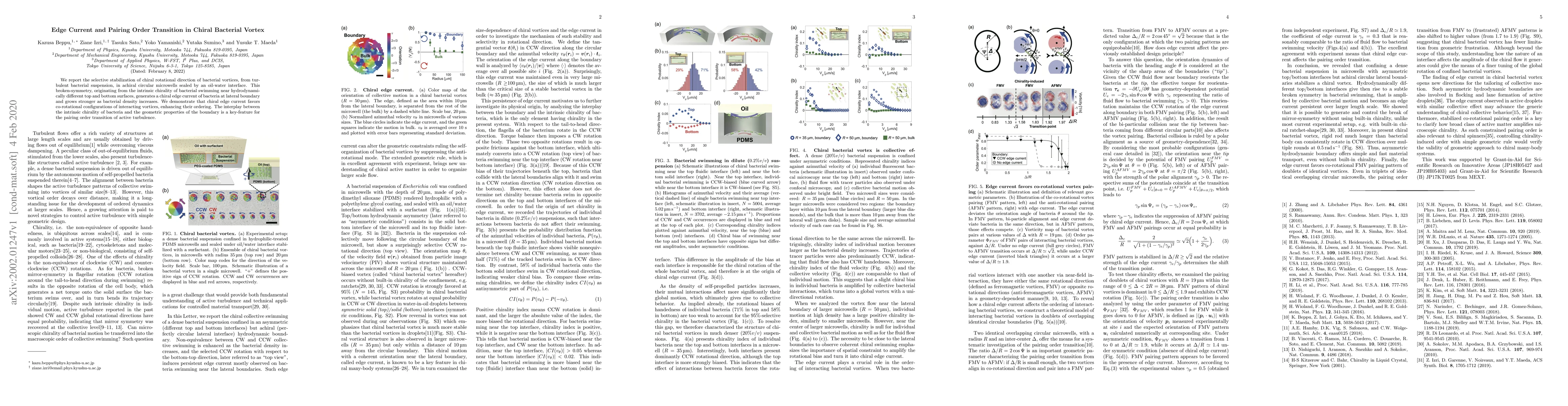 We report the selective stabilization of chiral rotational direction of bacterial vortices, from turbulent bacterial suspension, in achiral circular microwells sealed by an oil-water interface. This broken-symmetry, originating from the intrinsic chirality of bacterial swimming near hydrodynamically different top and bottom surfaces, generates a chiral edge current of bacteria at lateral boundary and grows stronger as bacterial density increases. We demonstrate that chiral edge current favors co-rotational configurations of interacting vortices, enhancing their ordering. The interplay between the intrinsic chirality of bacteria and the geometric properties of the boundary is a key-feature for the pairing order transition of active turbulence.