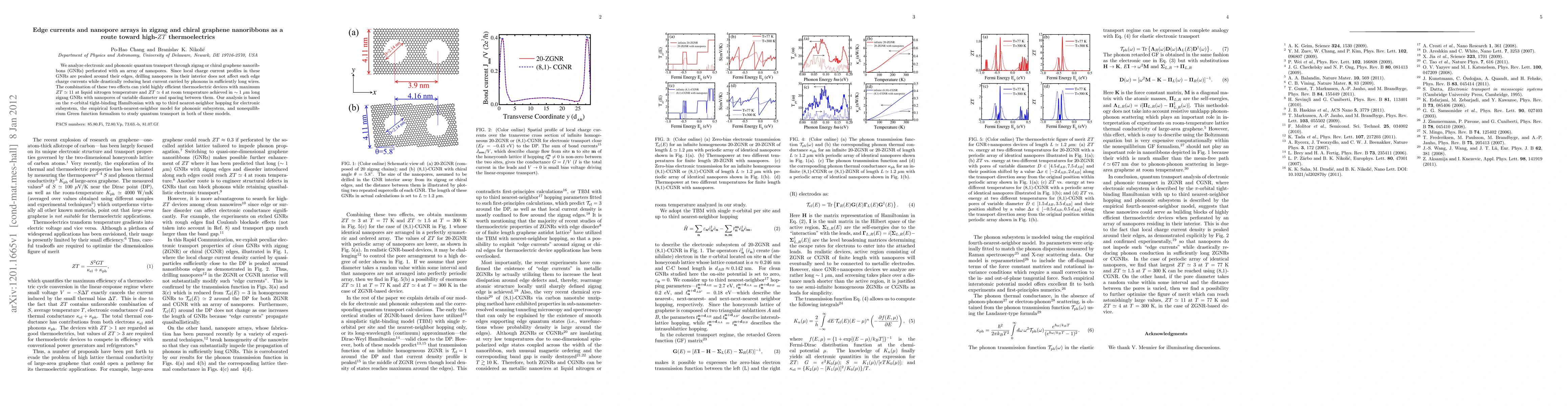 We analyze electronic and phononic quantum transport through zigzag or chiral graphene nanoribbons (GNRs) perforated with an array of nanopores. Since local charge current profiles in these GNRs are peaked around their edges, drilling nanopores in their interior does not affect such edge charge currents while drastically reducing heat current carried by phonons in sufficiently long wires. The combination of these two effects can yield highly efficient thermoelectric devices with maximum $ZT \simeq 11$ at liquid nitrogen temperature and $ZT \simeq 4$ at room temperature achieved in $\sim 1$ $\mu$m long zigzag GNRs with nanopores of variable diameter and spacing between them. Our analysis is based on the $\pi$-orbital tight-binding Hamiltonian with up to third nearest-neighbor hopping for electronic subsystem, the empirical fourth-nearest-neighbor model for phononic subsystem, and nonequilibrium Green function formalism to study quantum transport in both of these models.
