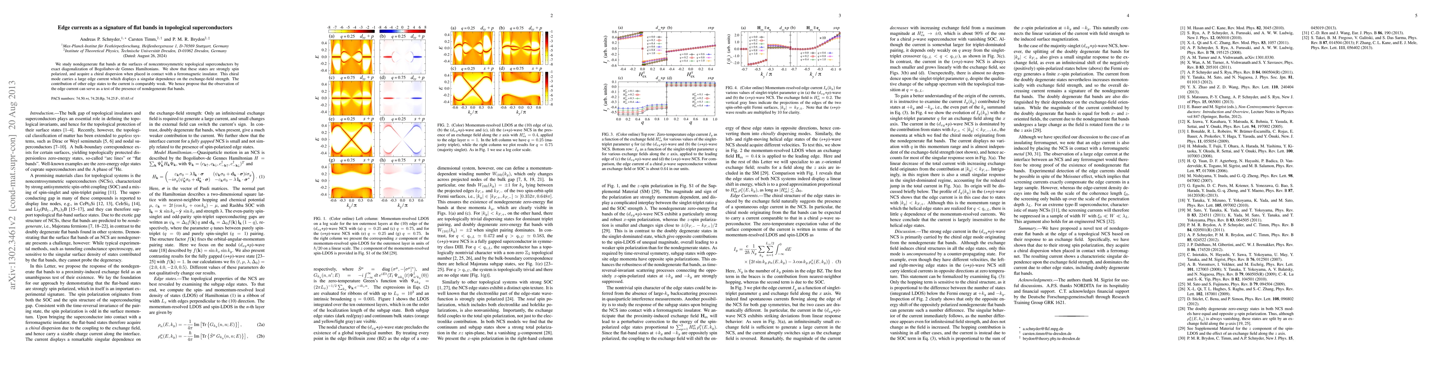 This paper investigates nondegenerate flat bands in topological superconductors, revealing strong spin polarization and chiral edge currents when in contact with a ferromagnetic insulator. The edge current's singular dependence on the exchange-field strength suggests it as a signature for detecting these flat bands.