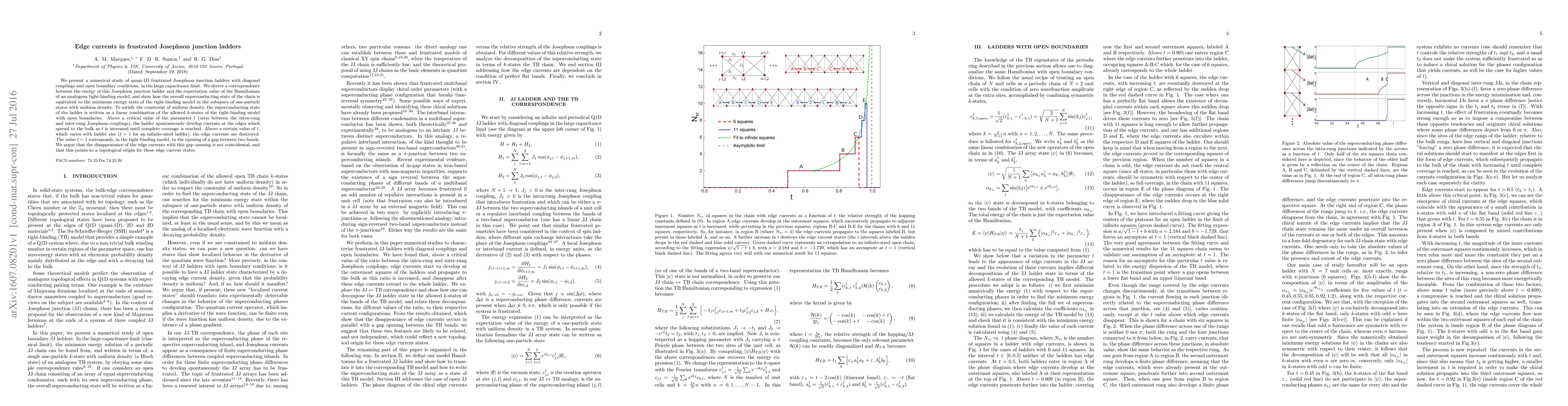We present a numerical study of quasi-1D frustrated Josephson junction ladders with diagonal couplings and open boundary conditions, in the large capacitance limit. We derive a correspondence between the energy of this Josephson junction ladder and the expectation value of the Hamiltonian of an analogous tight-binding model, and show how the overall superconducting state of the chain is equivalent to the minimum energy state of the tight-binding model in the subspace of one-particle states with uniform density. To satisfy the constraint of uniform density, the superconducting state of the ladder is written as a linear combination of the allowed k-states of the tight-binding model with open boundaries. Above a critical value of the parameter t (ratio between the intra-rung and inter-rung Josephson couplings), the ladder spontaneously develop currents at the edges which spread to the bulk as t is increased until complete coverage is reached. Above a certain value of t, which varies with ladder size (t = 1 for an infinite-sized ladder), the edge currents are destroyed. The value t = 1 corresponds, in the tight-binding model, to the opening of a gap between two bands. We argue that the disappearance of the edge currents with this gap opening is not coincidental, and that this points to a topological origin for these edge current states.