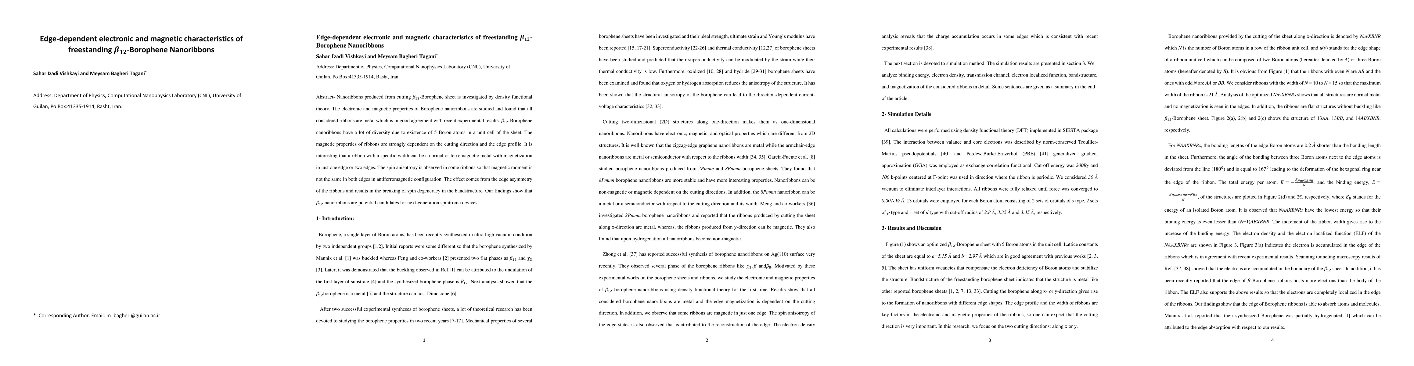 This study uses density functional theory to investigate the electronic and magnetic properties of β₁₂-Borophene nanoribbons, revealing that they are metallic and that their magnetic characteristics vary with cutting direction and edge profile. Edge asymmetry leads to spin anisotropy, suggesting potential for spintronic applications.