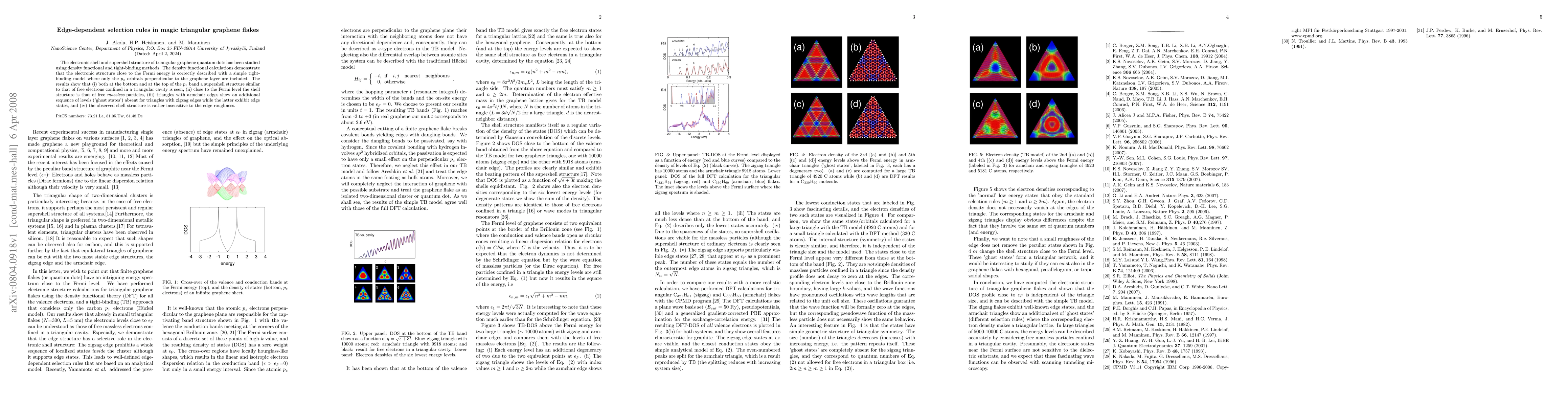 This study reveals edge-dependent selection rules in triangular graphene flakes, showing that armchair edges produce 'ghost states' while zigzag edges exhibit edge states, with both structures displaying a supershell structure near the Fermi level. The shell structure is largely unaffected by edge roughness.