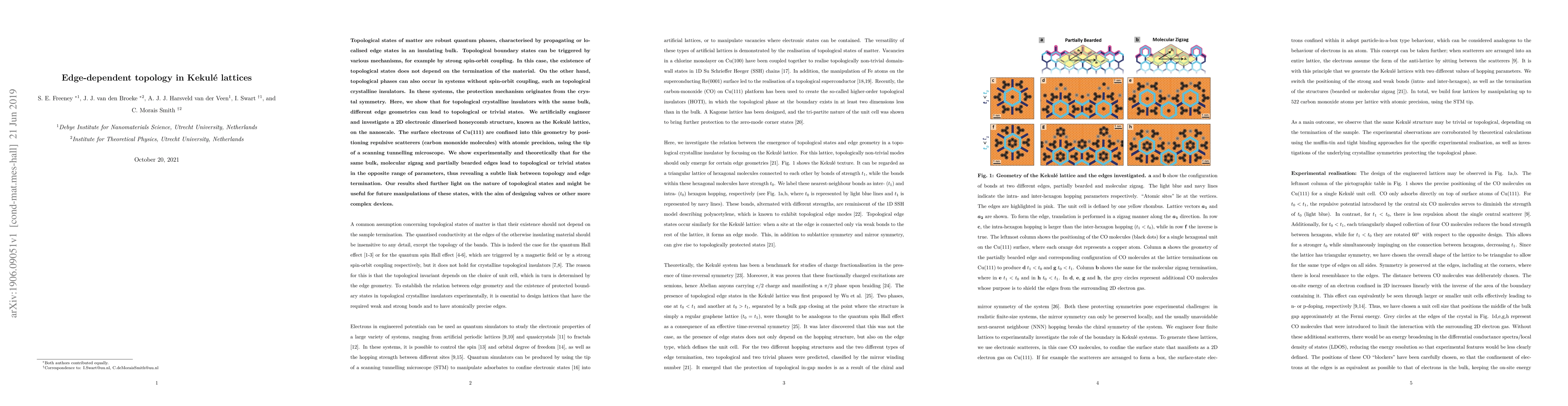 Topological states of matter are robust quantum phases, characterised by propagating or localised edge states in an insulating bulk. Topological boundary states can be triggered by various mechanisms, for example by strong spin-orbit coupling. In this case, the existence of topological states does not depend on the termination of the material. On the other hand, topological phases can also occur in systems without spin-orbit coupling, such as topological crystalline insulators. In these systems, the protection mechanism originates from the crystal symmetry. Here, we show that for topological crystalline insulators with the same bulk, different edge geometries can lead to topological or trivial states. We artificially engineer and investigate a 2D electronic dimerised honeycomb structure, known as the Kekul\'e lattice, on the nanoscale. The surface electrons of Cu(111) are confined into this geometry by positioning repulsive scatterers (carbon monoxide molecules) with atomic precision, using the tip of a scanning tunnelling microscope. We show experimentally and theoretically that for the same bulk, molecular zigzag and partially bearded edges lead to topological or trivial states in the opposite range of parameters, thus revealing a subtle link between topology and edge termination. Our results shed further light on the nature of topological states and might be useful for future manipulations of these states, with the aim of designing valves or other more complex devices.
