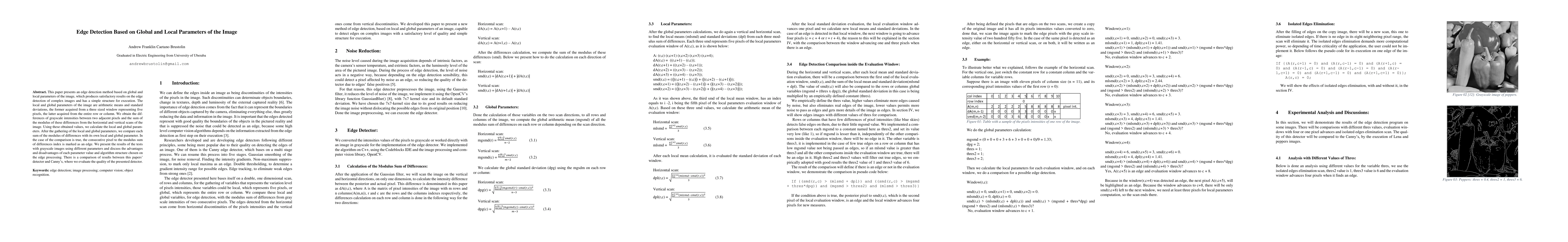 This paper presents an edge detection method based on global and local parameters of the image, which produces satisfactory results on the edge detection of complex images and has a simple structure for execution. The local and global parameters of the image are arithmetic means and standard deviations, the former acquired from a three sized window representing five pixels, the latter acquired from the entire row or column. We obtain the differences of grayscale intensities between two adjacent pixels and the sum of the modulus of these differences from the horizontal and vertical scans of the image. Using these obtained values, we calculate the local and global parameters. After the gathering of the local and global parameters, we compare each sum of the modulus of differences with its own local and global parameter. In the case of the comparison is true, the consecutive pixel to the modulus sum of differences index is marked as an edge. We present the results of the tests with grayscale images using different parameters and discuss the advantages and disadvantages of each parameter value and algorithm structure chosen on the edge processing. There is a comparison of results between this papers detector and Canny, where we evaluate the quality of the presented detector.