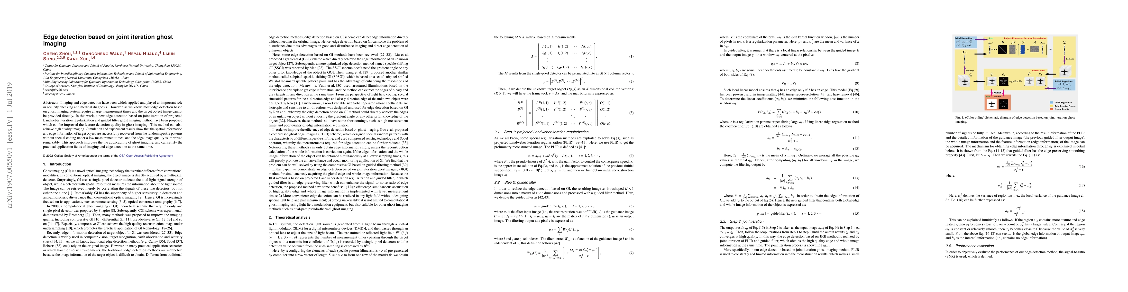 Imaging and edge detection have been widely applied and played an important role in security checking and medical diagnosis. However, as we know, most edge detection based on ghost imaging system require a large measurement times and the target object image cannot be provided directly. In this work, a new edge detection based on joint iteration of projected Landweber iteration regularization and guided filter ghost imaging method have been proposed which can be improved the feature detection quality in ghost imaging. This method can also achieve high quality imaging. Simulation and experiment results show that the spatial information and edge information of target object are successfully recovered from the random speckle patterns without special coding under a low measurement times, and the edge image quality is improved remarkably. This approach improves the the applicability of ghost imaging, and can satisfy the practical application fields of imaging and edge detection at the same time.