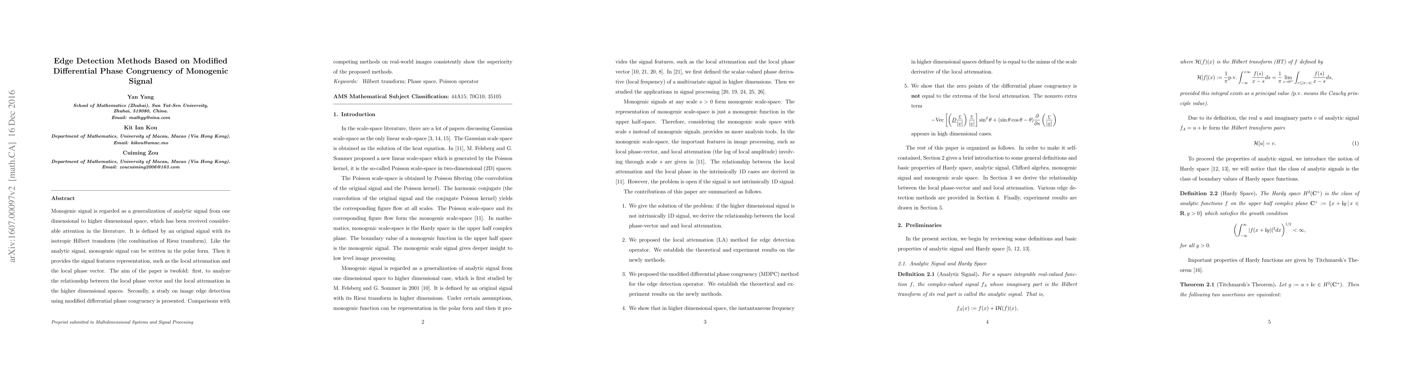 Edge Detection Methods Based on Differential Phase Congruency of Monogenic Image Abstract: Edge detection has been widely used in medical image processing and automatic diagnosis. Some novel edge detection algorithms,based on the monogenic scale-space, are proposed by detecting points of local extrema in local amplitude, the local attenuation and modified differential phase congruency methods. The monogenic scale-space is obtained from a known image by Poisson and conjugate Poisson filtering. In mathematics, it is the Hardy space in the upper half-space. The boundary value of the monogenic scale-space representation is a monogenic image. In the monogenic scale-space, the definitions involving scale, such as local amplitude,local attenuation, local phase angle, local phase vector and local frequency (phase derivatives) are proposed. Using Clifford analysis, the relations between the local attenuation and the local phase vector are obtained. These study will be improved the understanding of image analysis in higher dimensional spaces. Experimental results are shown by using some typical images.