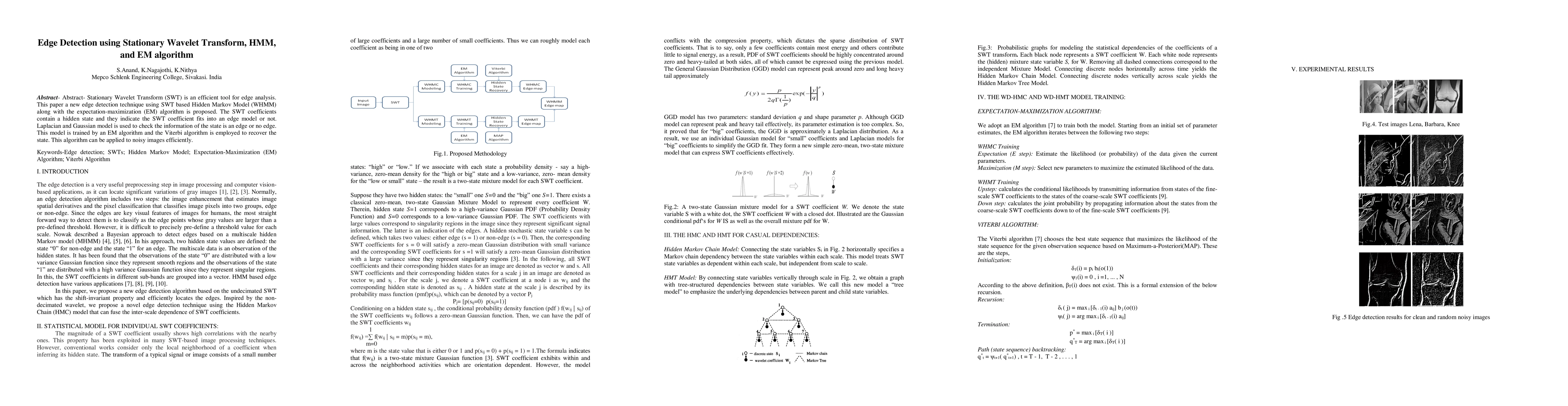 Stationary Wavelet Transform (SWT) is an efficient tool for edge analysis. This paper a new edge detection technique using SWT based Hidden Markov Model (WHMM) along with the expectation-maximization (EM) algorithm is proposed. The SWT coefficients contain a hidden state and they indicate the SWT coefficient fits into an edge model or not. Laplacian and Gaussian model is used to check the information of the state is an edge or no edge. This model is trained by an EM algorithm and the Viterbi algorithm is employed to recover the state. This algorithm can be applied to noisy images efficiently.