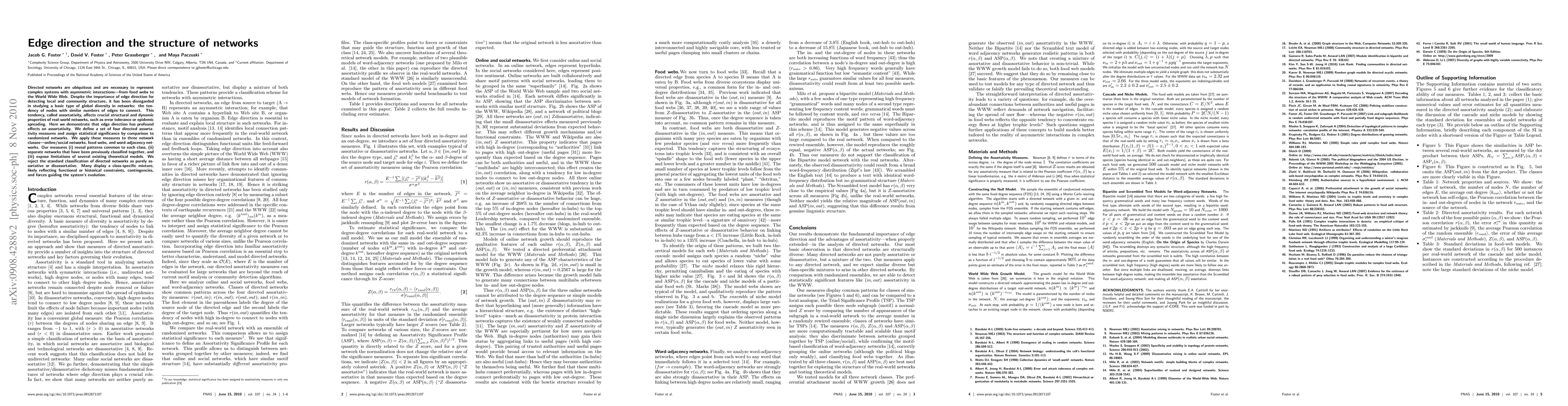 Directed networks are ubiquitous and are necessary to represent complex systems with asymmetric interactions---from food webs to the World Wide Web. Despite the importance of edge direction for detecting local and community structure, it has been disregarded in studying a basic type of global diversity in networks: the tendency of nodes with similar numbers of edges to connect. This tendency, called assortativity, affects crucial structural and dynamic properties of real-world networks, such as error tolerance or epidemic spreading. Here we demonstrate that edge direction has profound effects on assortativity. We define a set of four directed assortativity measures and assign statistical significance by comparison to randomized networks. We apply these measures to three network classes---online/social networks, food webs, and word-adjacency networks. Our measures (i) reveal patterns common to each class, (ii) separate networks that have been previously classified together, and (iii) expose limitations of several existing theoretical models. We reject the standard classification of directed networks as purely assortative or disassortative. Many display a class-specific mixture, likely reflecting functional or historical constraints, contingencies, and forces guiding the system's evolution.