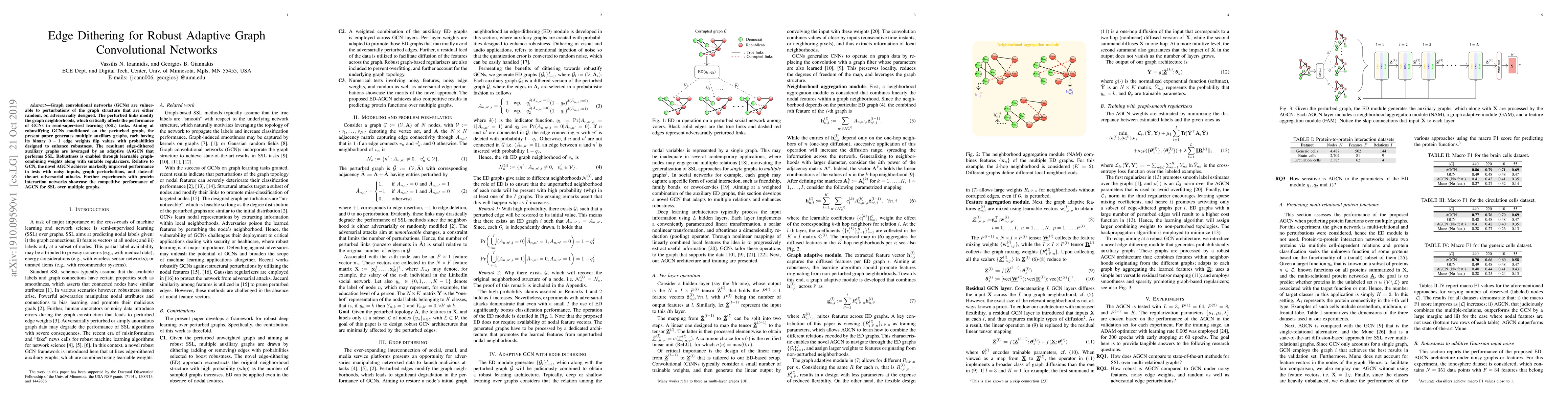 The paper introduces Edge Dithering for Robust Adaptive Graph Convolutional Networks (AGCN), which generates multiple auxiliary graphs with flipped edge weights to enhance GCN robustness against graph perturbations. AGCN, using learnable weights and regularizers, outperforms GCN in noisy and adversarial conditions, demonstrating superior performance in Semi-Supervised Learning tasks and real-world protein interaction networks.