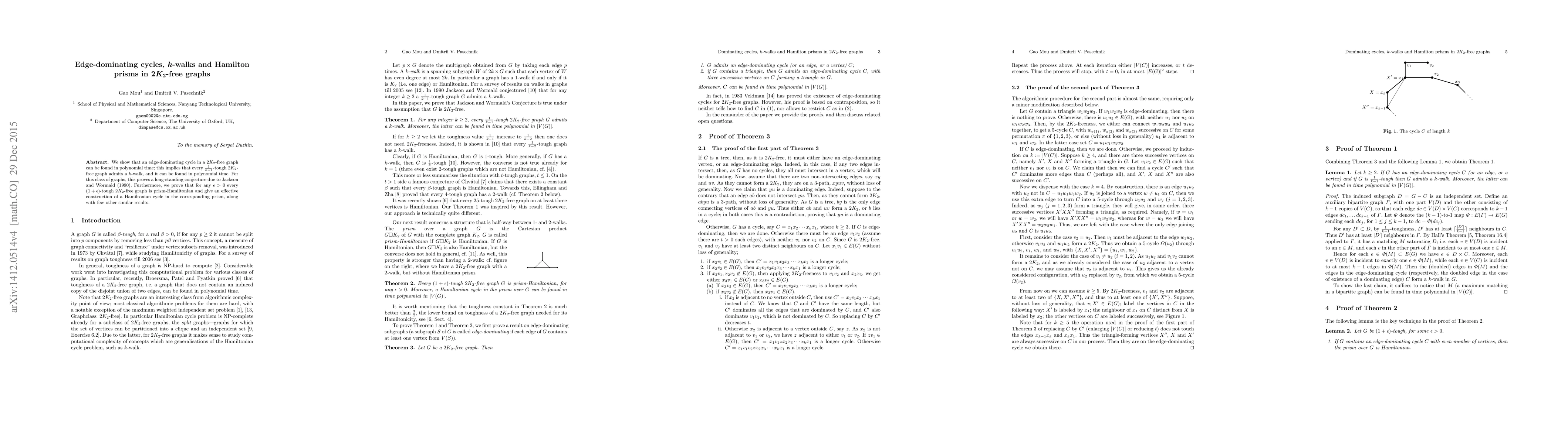 We show that an edge-dominating cycle in a $2K_2$-free graph can be found in polynomial time; this implies that every 1/(k-1)-tough $2K_2$-free graph admits a k-walk, and it can be found in polynomial time. For this class of graphs, this proves a long-standing conjecture due to Jackson and Wormald (1990). Furthermore, we prove that for any \epsilon>0 every (1+\epsilon)-tough $2K_2$-free graph is prism-Hamiltonian and give an effective construction of a Hamiltonian cycle in the corresponding prism, along with few other similar results.