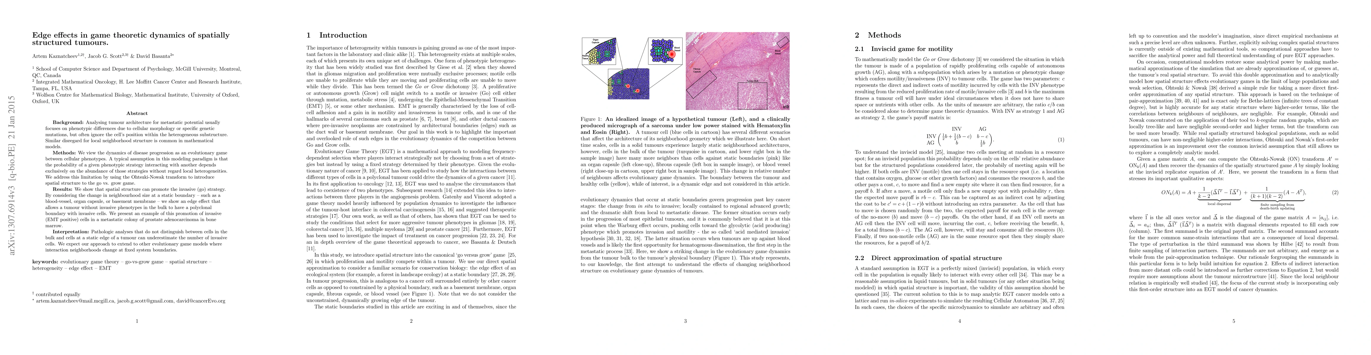 Background: Analysing tumour architecture for metastatic potential usually focuses on phenotypic differences due to cellular morphology or specific genetic mutations, but often ignore the cell's position within the heterogeneous substructure. Similar disregard for local neighborhood structure is common in mathematical models. Methods: We view the dynamics of disease progression as an evolutionary game between cellular phenotypes. A typical assumption in this modeling paradigm is that the probability of a given phenotypic strategy interacting with another depends exclusively on the abundance of those strategies without regard local heterogeneities. We address this limitation by using the Ohtsuki-Nowak transform to introduce spatial structure to the go vs. grow game. Results: We show that spatial structure can promote the invasive (go) strategy. By considering the change in neighbourhood size at a static boundary -- such as a blood-vessel, organ capsule, or basement membrane -- we show an edge effect that allows a tumour without invasive phenotypes in the bulk to have a polyclonal boundary with invasive cells. We present an example of this promotion of invasive (EMT positive) cells in a metastatic colony of prostate adenocarcinoma in bone marrow. Interpretation: Pathologic analyses that do not distinguish between cells in the bulk and cells at a static edge of a tumour can underestimate the number of invasive cells. We expect our approach to extend to other evolutionary game models where interaction neighborhoods change at fixed system boundaries.