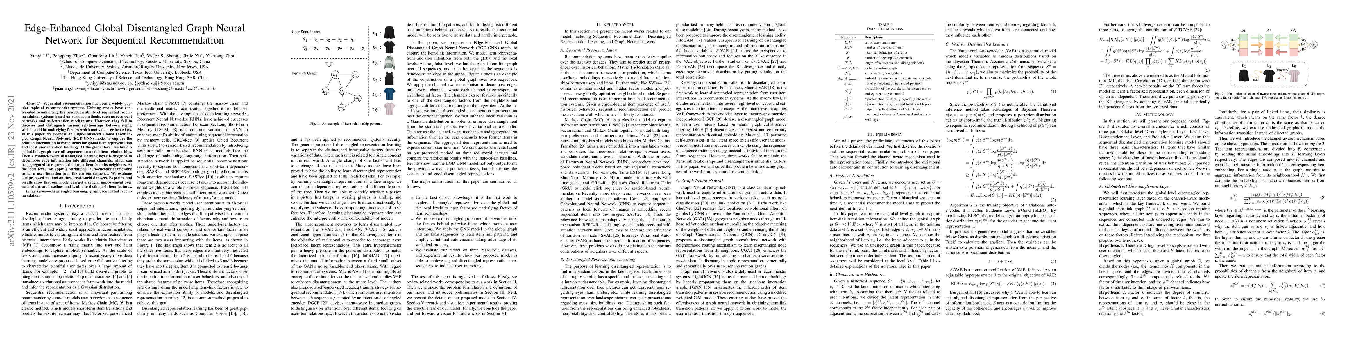 This paper proposes an Edge-Enhanced Global Disentangled Graph Neural Network (EGD-GNN) to enhance sequential recommendation by capturing item relationships and user intentions. The model builds a global-link graph and uses a disentangled learning layer to represent items, while a variational auto-encoder learns user intentions, achieving superior performance over baselines.