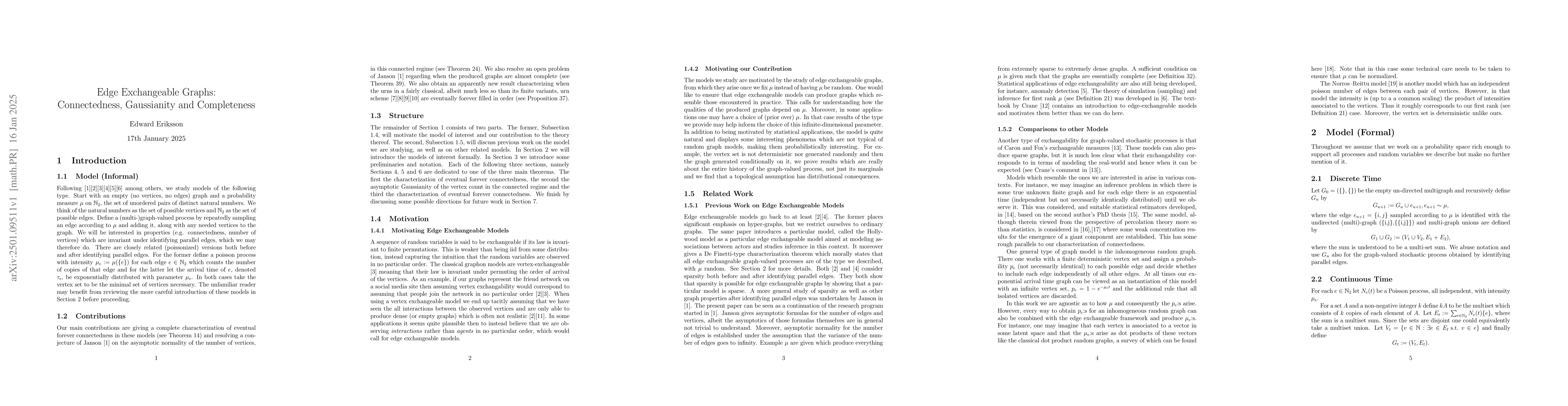 Summary: This paper investigates asymptotic properties of edge exchangeable random graphs, providing a necessary and sufficient condition for their eventual connectedness, a sufficient condition for the asymptotic normality of vertex counts, and a condition for eventual completeness.