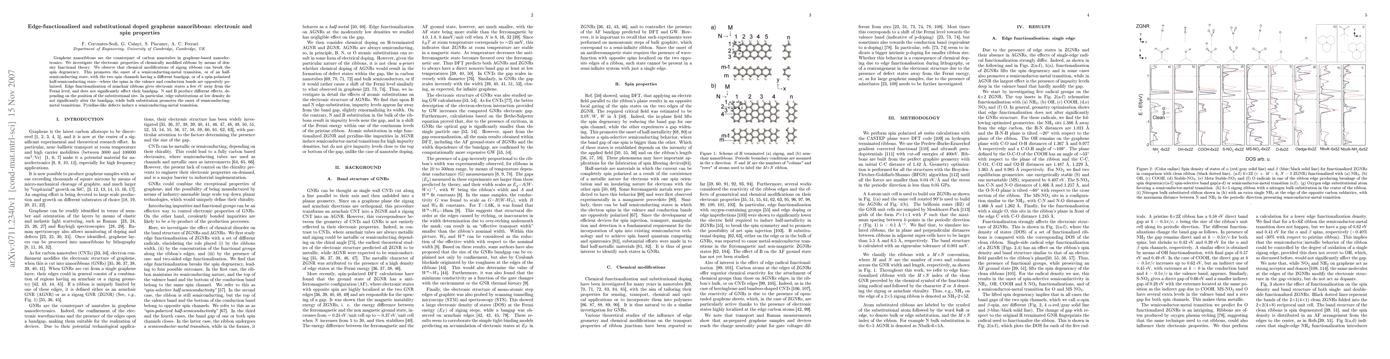 This study explores the electronic and spin properties of edge-functionalized and substitutionally doped graphene nanoribbons using density functional theory. Chemical modifications, especially on zigzag ribbons, can break spin degeneracy, leading to semiconducting-metal transitions or spin-polarized states. Edge functionalization of armchair ribbons introduces states near the Fermi level without significantly altering the bandgap.