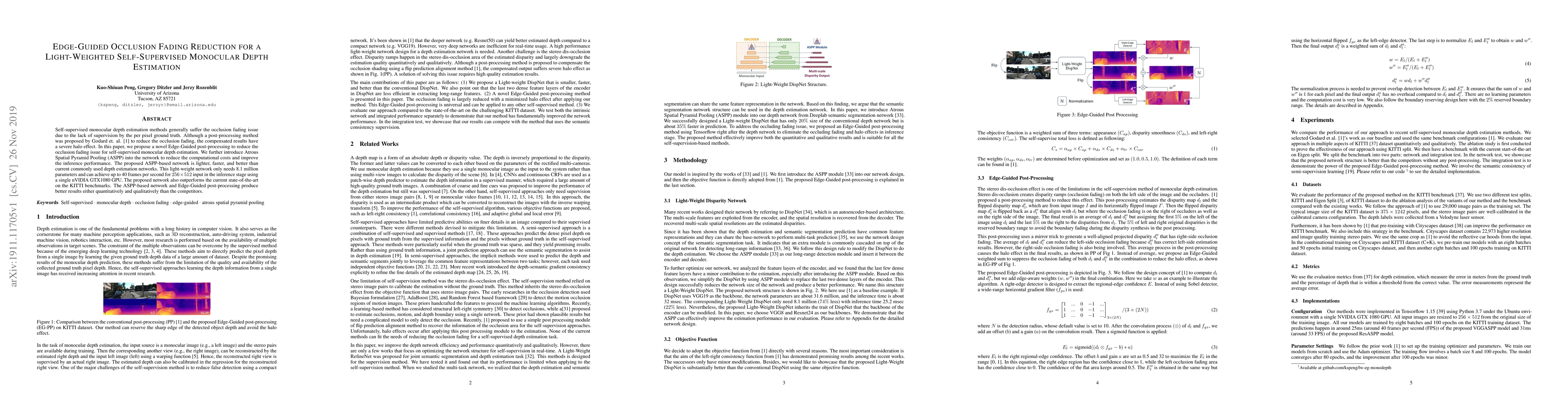 This paper proposes an Edge-Guided post-processing method to reduce occlusion fading in self-supervised monocular depth estimation, along with Atrous Spatial Pyramid Pooling (ASPP) to enhance computational efficiency. The resulting light-weight network outperforms existing methods on the KITTI benchmark, achieving faster inference speeds and better depth estimation accuracy.